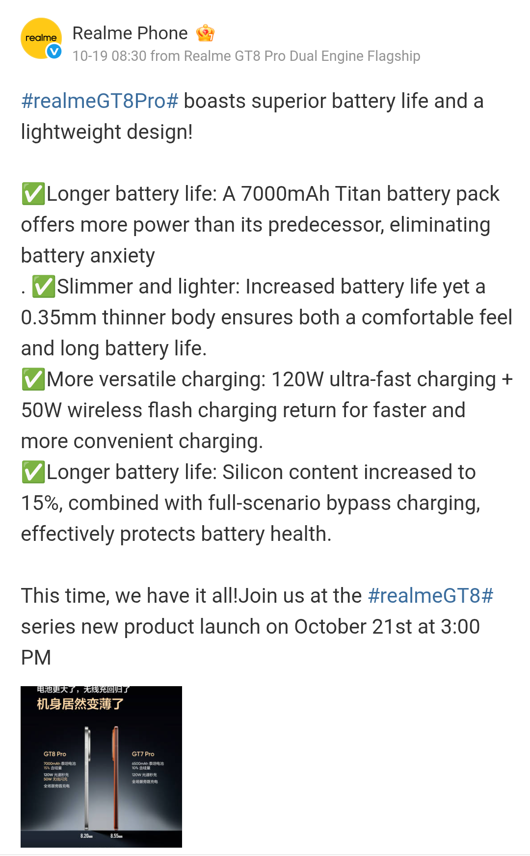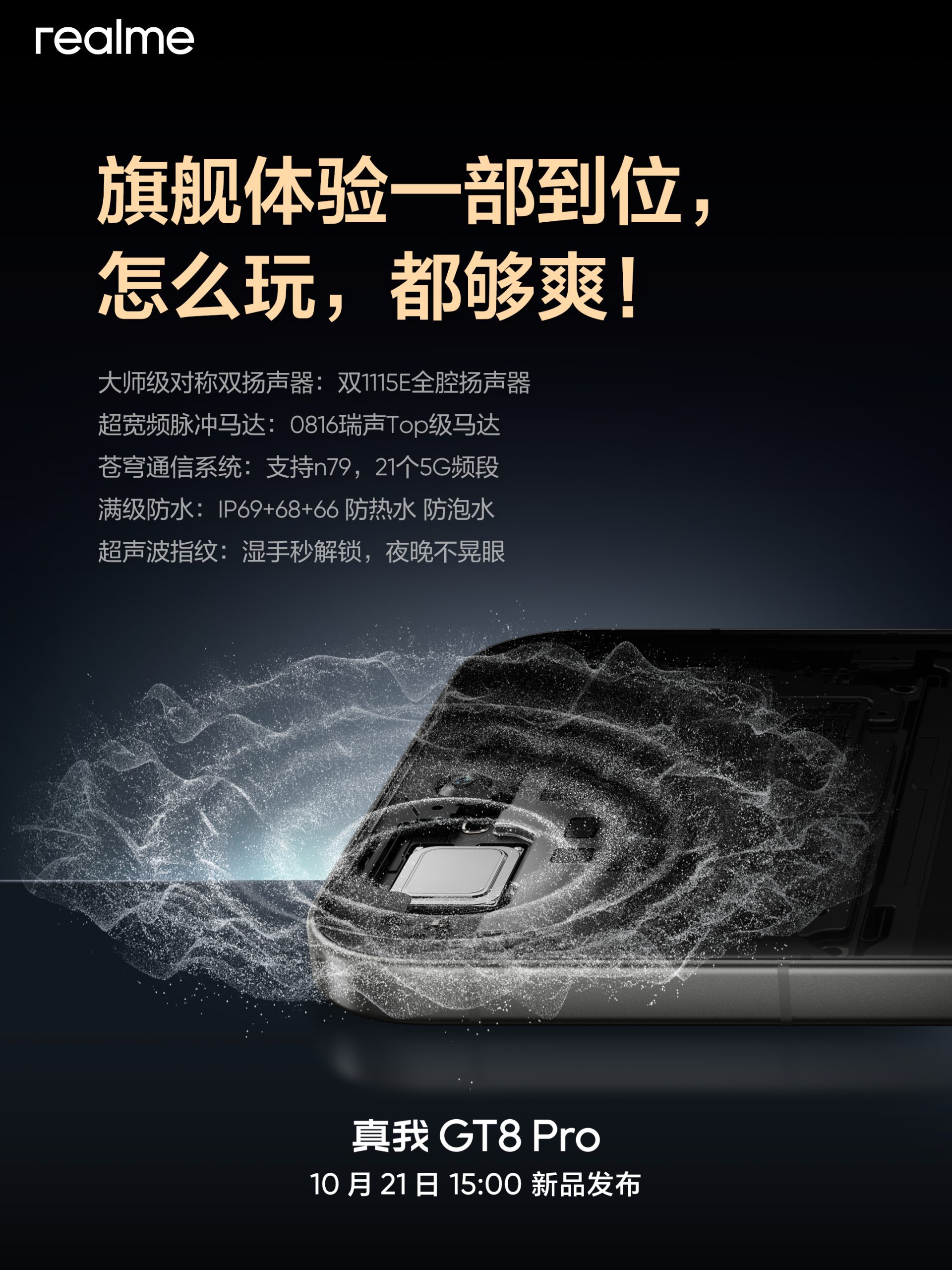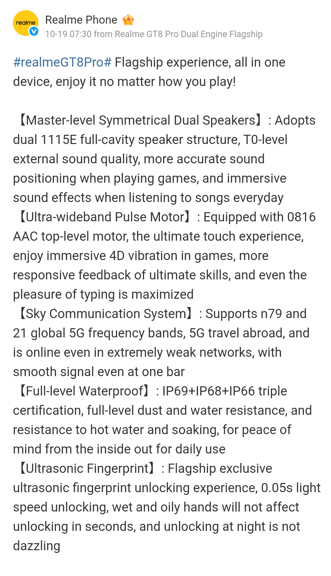 About the Realme GT 8 Pro, specs such as the Master-Level Symmetrical Dual Speakers (dual 1115E full-cavity speaker structure), Ultra-Wideband Pulse Motor (0816 AAC top-level motor with 4D vibration), Sky Communication System (supports n79 and 21 global 5G frequency bands), IP69 + IP68 + IP66 full-level waterproof triple certification, and the ultrasonic fingerprint unlocking (0.05-second) have been teased. Additionally, even with the 7000 mAh large battery, the device is revealed to offer a slimmer (8.2mm) and lighter form factor, and the body is thinner by 0.35mm when compared to its predecessor. Notably, a 15% increased battery life, 120W wired + 50W wireless fast charging, along with a bypass charging capability have also been teased for the Snapdragon 8 Elite Gen 5-powered flagship device.