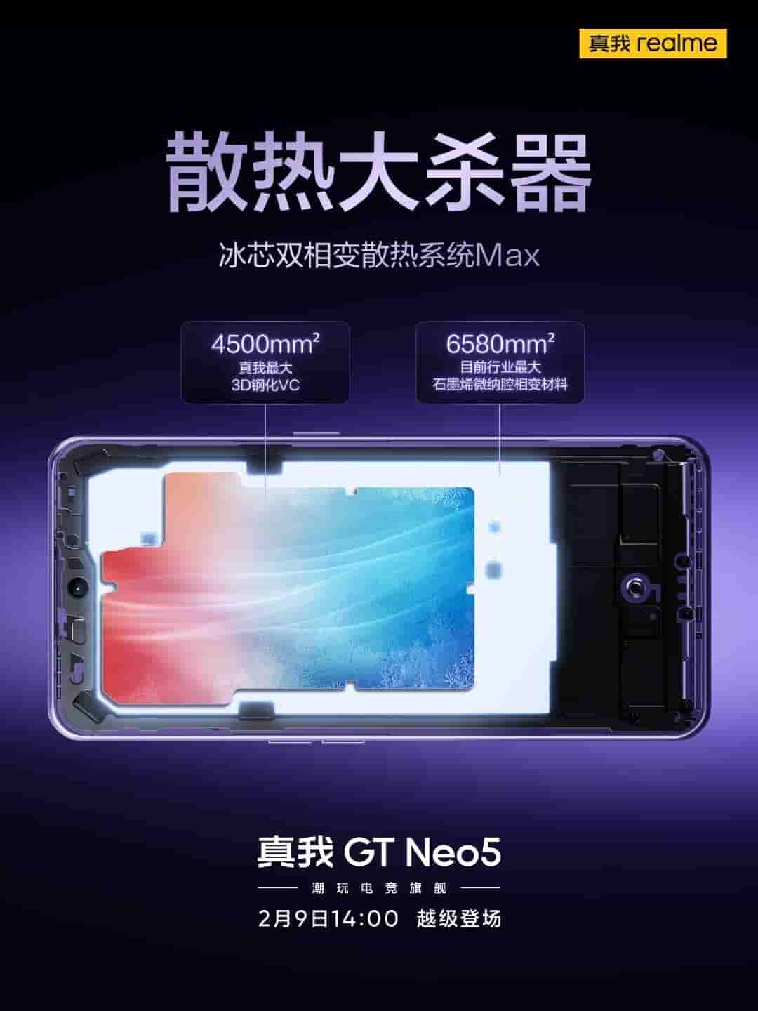 Realme has also confirmed that the GT Neo 5 will be equipped with a new ice core dual-phase heat dissipation system with a surface area of 6580mm². It will house the industry’s largest graphene micro-nano cavity phase change material, measuring 4500mm² for efficient cooling inside the device.