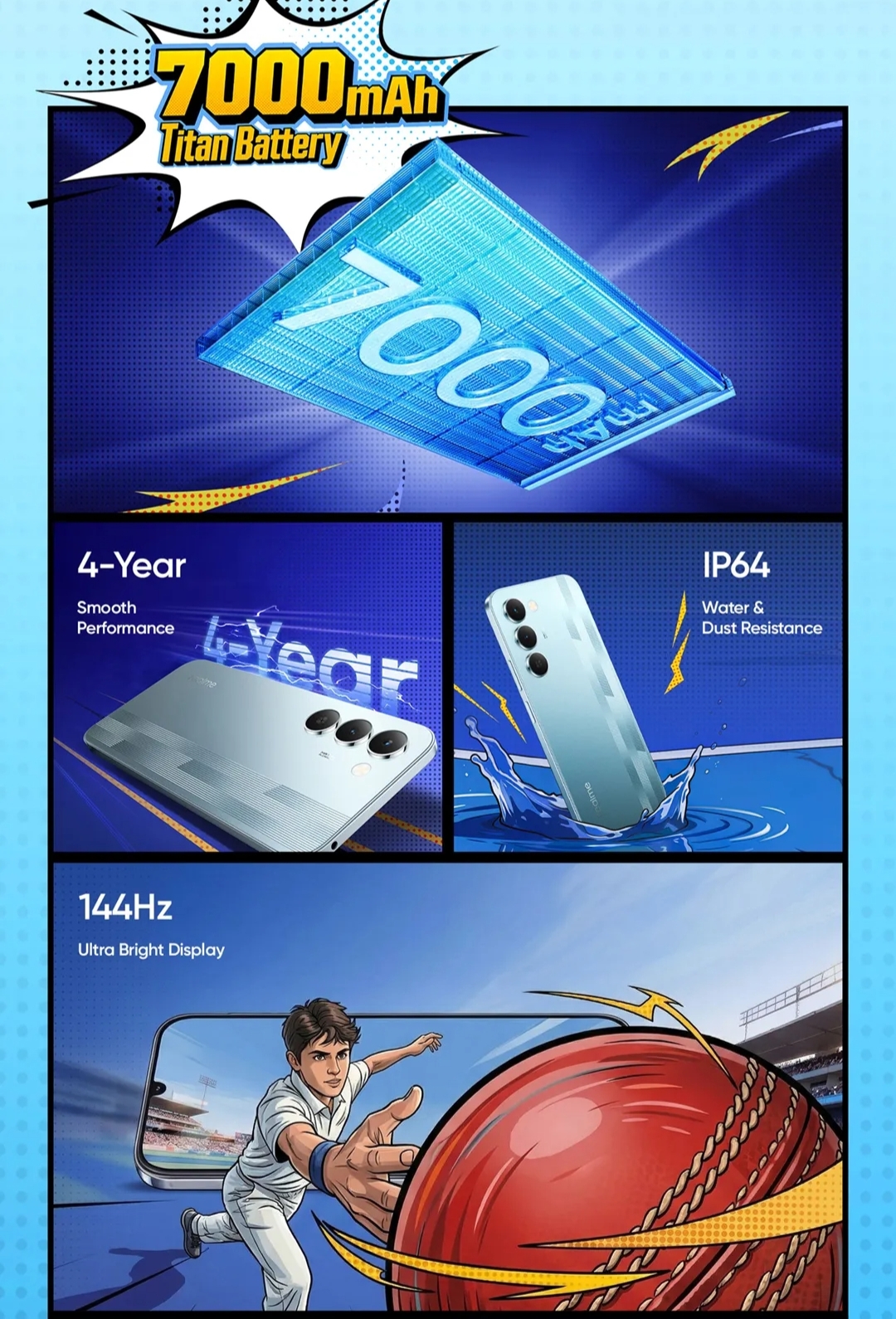 It sports a 6.8-inch Ultra Bright display that offers a 144Hz refresh rate, 900 nit maximum brightness and 180Hz touch sampling rate. The smartphone comes with Bedtime mode, paper-like display, full brightness DC Dimming and Flicker-free DC Dimming. It is powered by MediaTek Dimensity 6300 SoC (560,000+ AnTuTu V11 score) built on a 6nm advanced process.