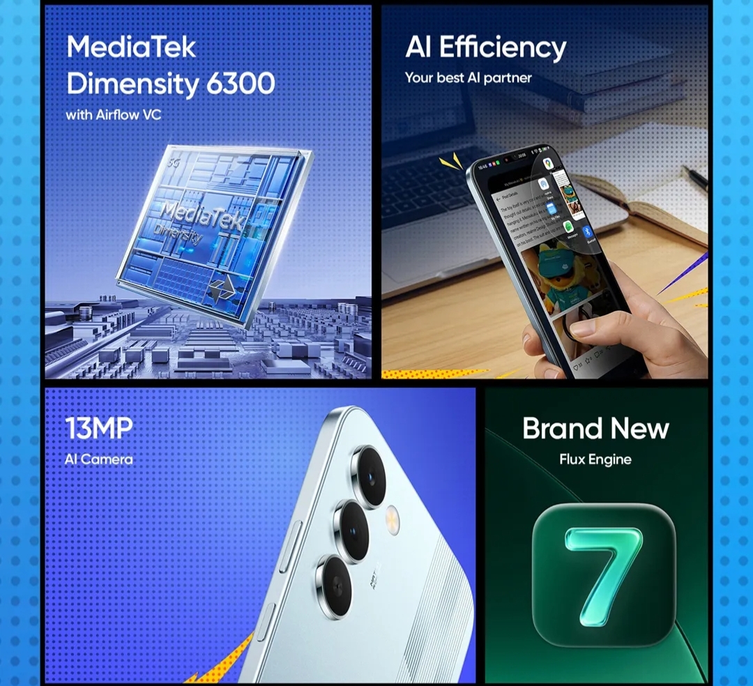 It comes with a 13MP AI rear camera. The device runs on Realme UI 7.0, which boasts features like ice cube icons, misty glass control center and breathing dock. It will come in Thunder Black and Frost Silver colours.