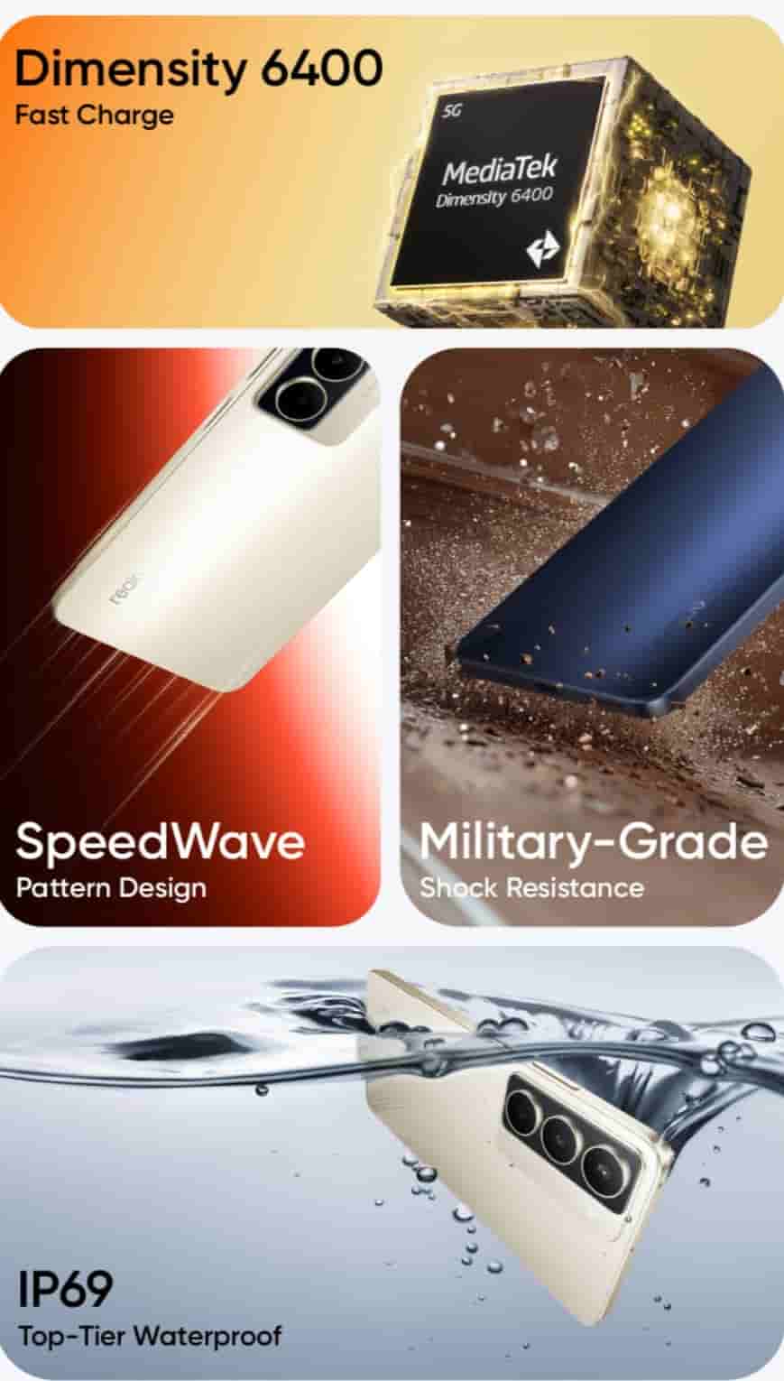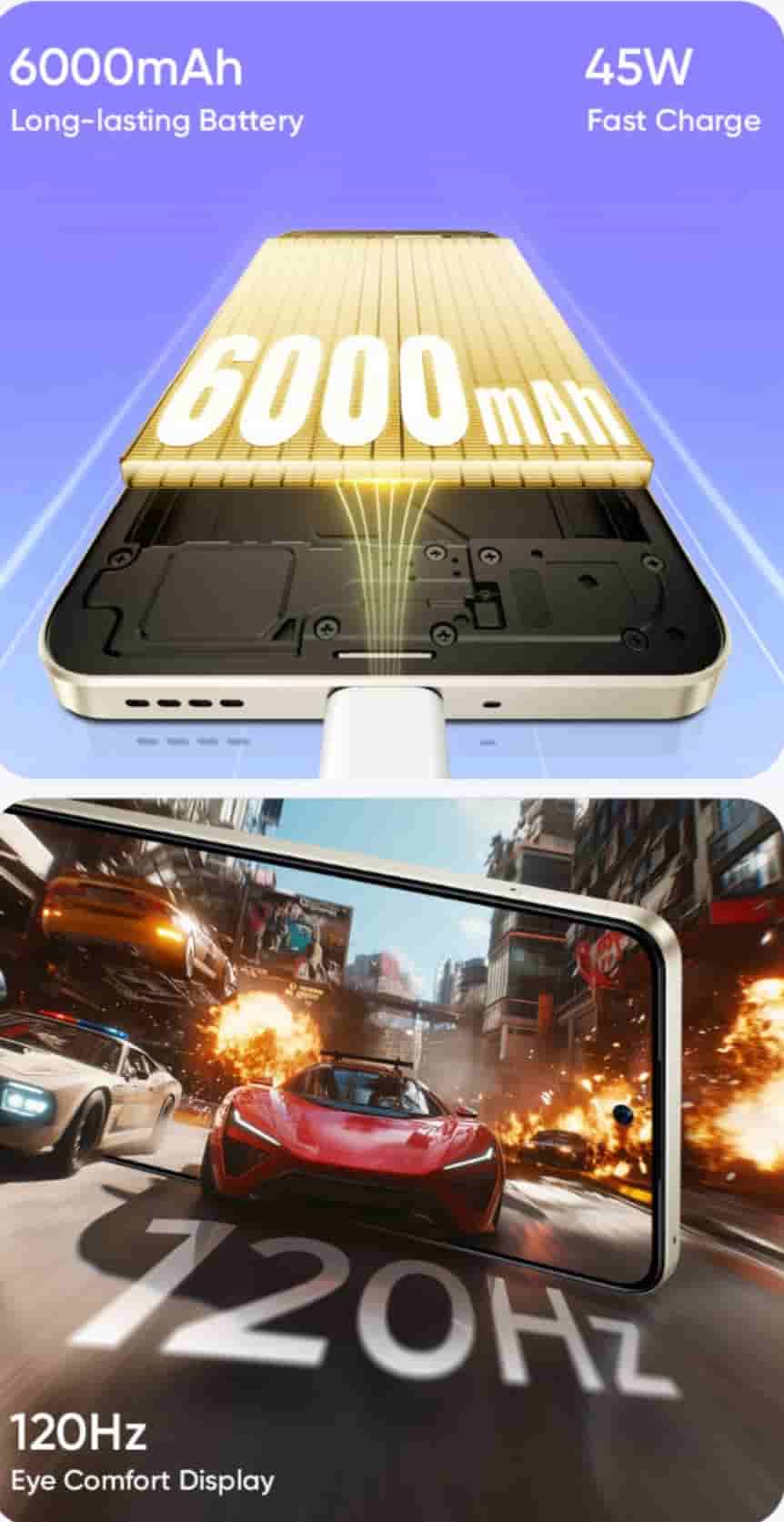 The device sports a 6.72-inch eye comfort display that offers a 120Hz refresh rate, FHD+ screen resolution, 950 nits peak brightness, up to 240Hz touch sampling rate, and 82% NTSC color gamut. It is powered by MediaTek Dimensity 6400 SoC paired with up to 8GB RAM and 128GB storage. It also offers up to 18GB of Dynamic RAM. The device is backed by a massive 6000mAh battery and supports 45W wired fast charging. It runs on Realme UI 6.0 based on Android 15.