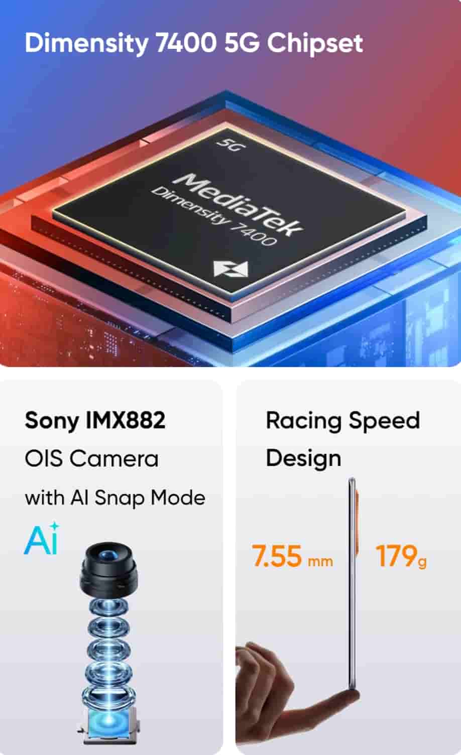 The smartphone sports a 6.77-inch OLED display that offers FHD+ screen resolution,100% DCI-P3 color gamut, 4500 nits peak brightness, up to 120Hz refresh rate, and a maximum 240Hz touch sampling rate. It is powered by MediaTek Dimensity 7400 SoC paired with up to 12GB RAM and 256GB UFS 3.1 storage. It also offers up to 14GB of dynamic RAM. It runs on Realme UI 6.0 based on Android 15 OS. The device packs up 50MP Sony IMX882 OIS main camera and a 2MP monochrome camera on the rear side, while on the front, it features a 16MP selfie camera.
