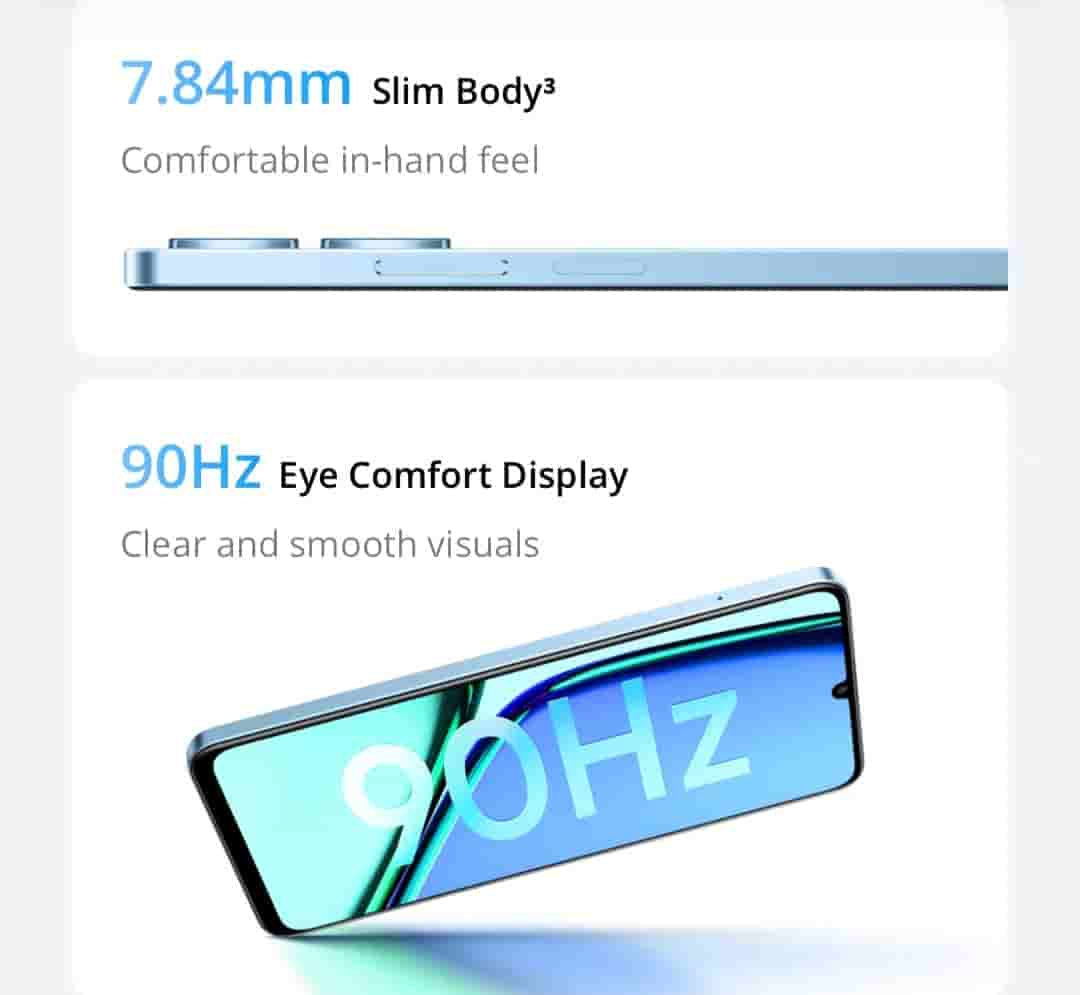 The smartphone features a 6.74-inch display that offers a 90Hz refresh rate, 180Hz sampling rate, 560 nits peak brightness, and Eye Comfort mode. It is powered by a Unisoc T612 processor that is paired with up to 6GB RAM and 128GB internal storage. It runs on Realme UI based on Android 14. It is backed by a 5000 mAh battery that supports 10W charging.