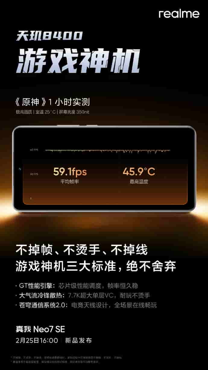 Speaking more, Realme’s Neo 7 SE smartphone will be carrying all three characteristics needed on a gaming device, which includes no frame drops, no heat, and no disconnection, thanks to the GT Performance Engine x Airflow Cold Front Cooling (7.7K Super Large Single-Layer VC ) x Sky Communication System 2.0 (E-sports antenna design) combination. Also, in the Genshin Impact 1-hour test, the device continued to offer extremely high full frame picture quality (59.1 fps average frame rate and 45.9° maximum temperature).