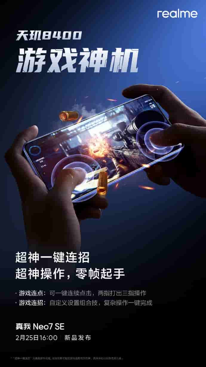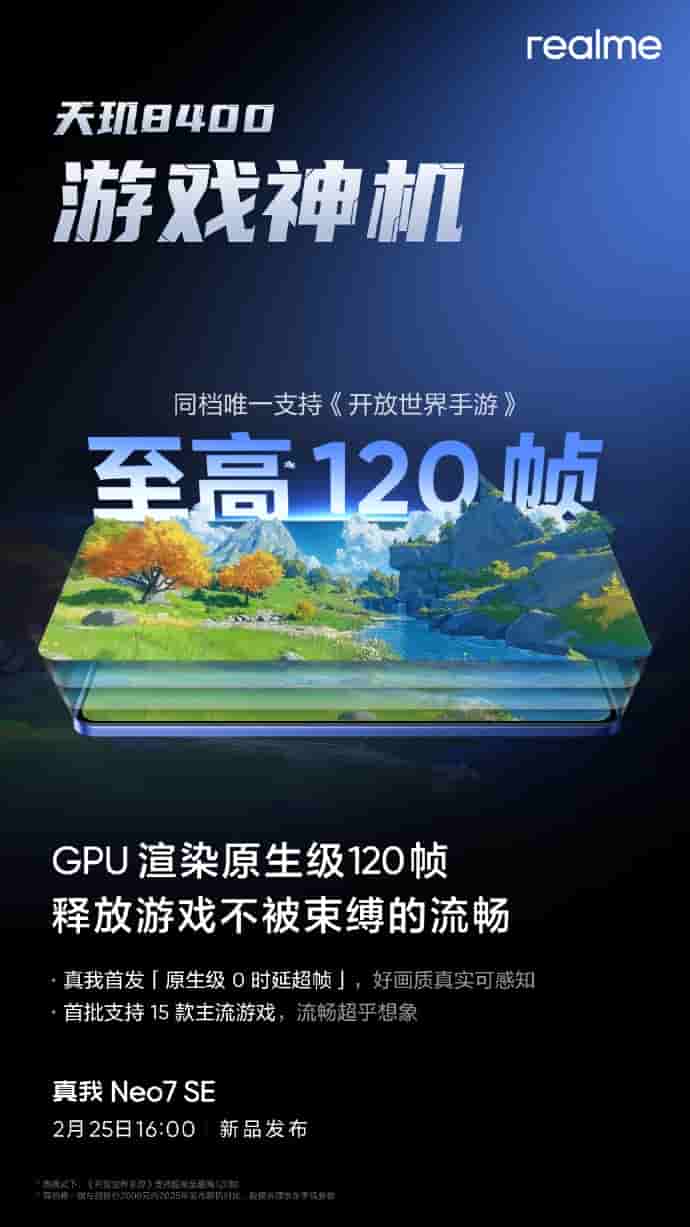 As per what has been shared via the new teaser posters, the Realme Neo 7 SE will come with a ‘Super God One-Click Combo’ feature which will enable users to enjoy capabilities such as three finger operations using two fingers, customization of combo skills, and complete complex operations automatically. It will also be the only smartphone of its segment to support ‘Open World Mobile Games’ at up to 120 frames. The first batch support will be provided for 15 games.