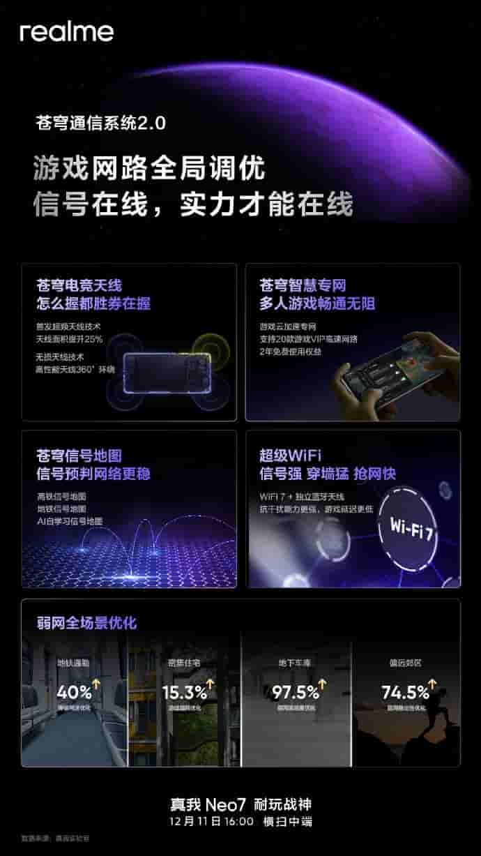 The upcoming Realme Neo 7 device is revealed to equip itself with the Sky Communication System 2.0, ensuring better connectivity and a stable gaming experience for users. It features the Cangqiong E-Sports Antenna with 25% increased antenna area and 360° degree connectivity, Cangqiong Wisdom Private for unobstructed network player games, Cangqiong signal map signal for accessibility in areas were network issues might be faced, and super Wi-Fi signal with Wi-Fi 7 and independent Bluetooth antenna.