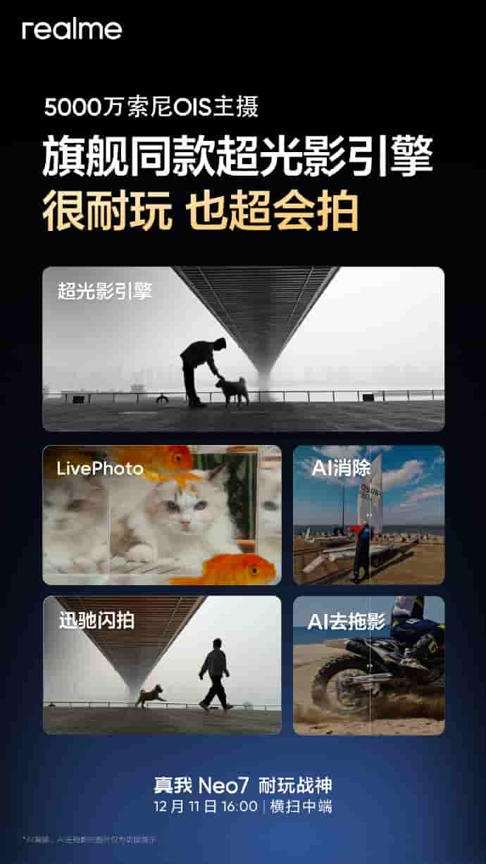 The Realme Neo 7 smartphone is now pointed out to feature a 50MP Sony OIS main camera. Along with this, camera features like Super Light and Shadow Engine, LivePhoto, AI Elimination, Centrino Flash Shot, and AI Shadow removal have also been teased.