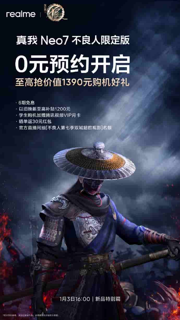 Weibo users who post on the topic #TrueMyNeo7BadPeopleLimitedEdition# can unlock the following surprise benefits: topic interaction volume reached 10W- unlock 10 Tencent Video VIP monthly cards, topic interaction volume reached 20W-unclock 10 exclusive Neo 7 Bad Guys peripherals, topic interaction volume reached 30W- unlock 1 Realme phone.