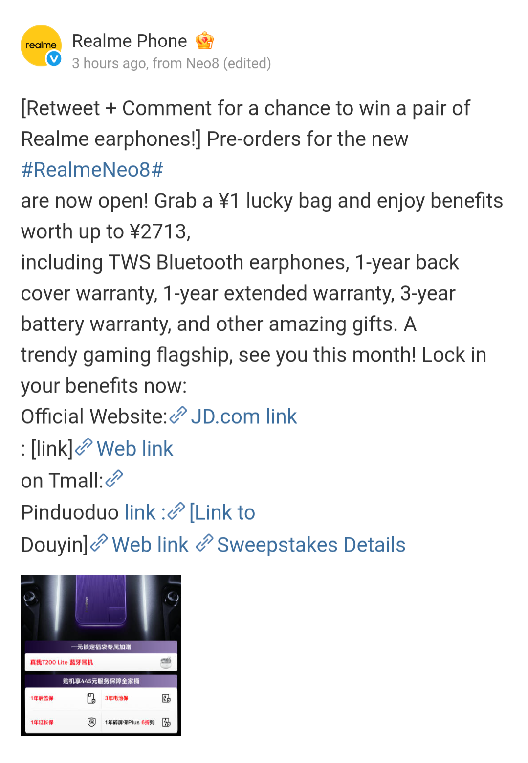 Regarding its pre-order details, interested Chinese customers can get the Realme Neo 8 lucky bag at just CNY 1, and become eligible for benefits of up to CNY 2713. The benefits will include the TWS Bluetooth earphones (Realme T200 Lite*), 1-year back cover warranty, 1-year extended warranty, 3-year battery warranty, and many other amazing gifts. It (lucky bag) will be available on the brand’s official website, JD.com, Tmall, Pinduoduo, and Douyin.