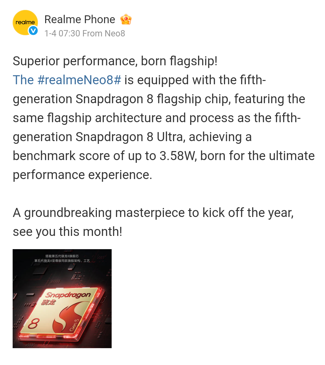 Realme’s Neo 8 smartphone is being addressed as a ‘new generation of trendy gaming flagship’, and it will be breaking its cover in the Chinese market this month in January 2026. The device is also confirmed to use Qualcomm’s latest Snapdragon 8 Gen 5 chipset, and it has achieved 3.58 million points overall performance score on the AnTuTu benchmark.
