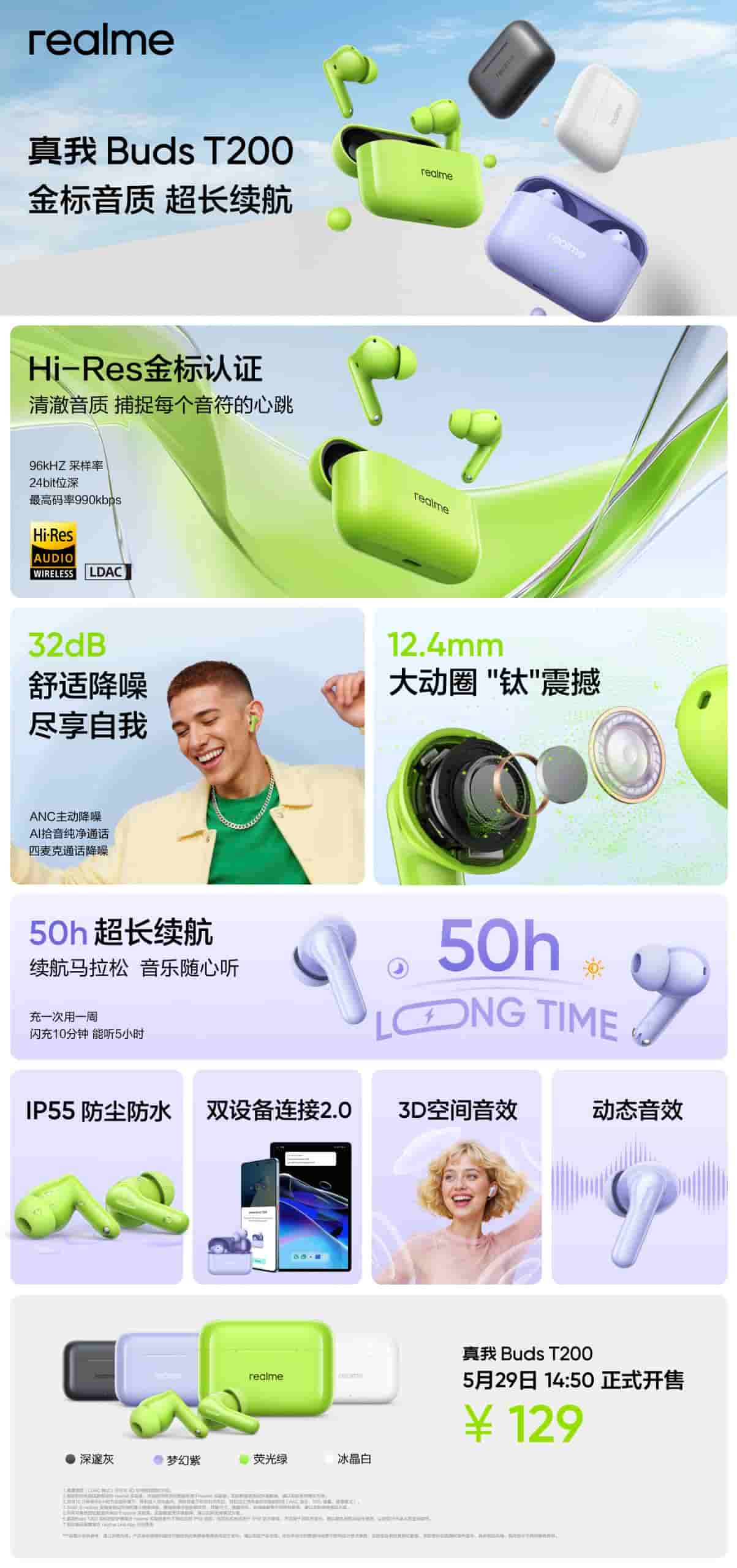 Realme’s Buds T200 earbuds device is IP55 dust and water resistant, has Dual Device Connection 2.0, supports 3D spatial sound, and it also delivers dynamic sound effects. Up to 50 hours of battery life can be expected from the earbuds, and 10 minutes charge is enough to get a playtime of up to 5 hours. Consumers will be able to get the device in four colors – Deep Gray, Fantasy Purple, Fluorescent Green, and Ice Crystal White.