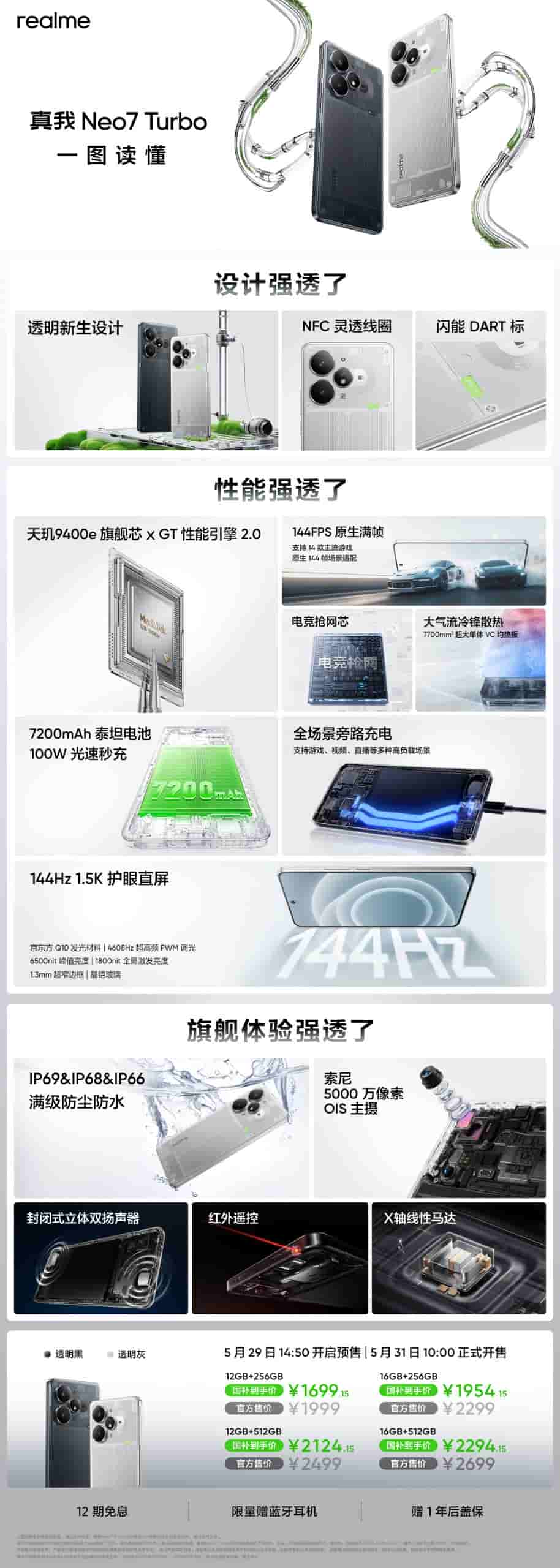The Realme Neo 7 Turbo smartphone features a new transparent design and is powered by the MediaTek Dimensity 9400e flagship chipset. It also equips the GT Performance Engine 2.0, and has a 7700 mm² large single vapor chamber heat solution with high airflow cold front cooling capability. Additionally, it is also equipped with an E-Sports Network Grabbing Chip too. Four storage models are available – 12GB/256GB, 16GB/256GB, 12GB/512GB, and 16GB/512GB.