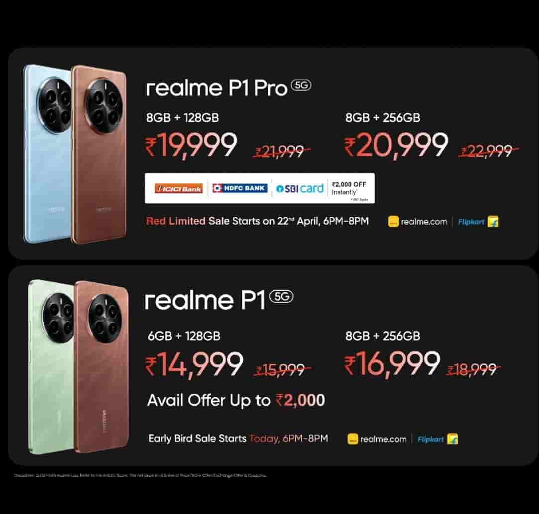The Realme P1 5G smartphone is priced at Rs 14,999 for the 6GB/128GB variant while its 8GB/256GB storage variant is priced at Rs 16,999. Buyers can avail of offers of up to Rs 2,000. The Realme P1 Pro 5G smartphone is priced at Rs 19,999 for the 8GB/128GB variant while its 8GB/256GB variant is priced at Rs 20,999. Buyers can get up to Rs 2,000 discount on ICICI/HDFC/SBI cards. The Red Limited Sale of the P1 Pro smartphone will start on 22nd April between 6 PM to 8 PM. The early bird sale of the Realme P1 will start today at 6 PM to 8 PM. The smartphones are listed on Flipkart and Realme’s official website.
