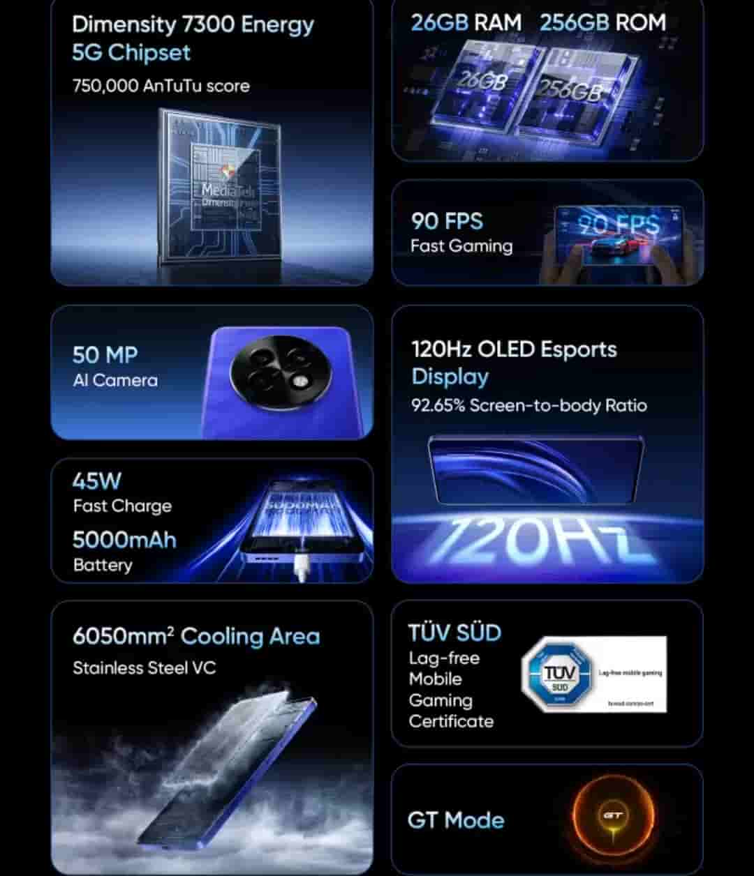 This latest smartphone is powered by MediaTek Dimensity 7300 Energy 5G SoC that arrives with a 750,000 AnTuTu score. The chipset is paired with up to 256 GB UFS 3.1 storage and 26 GB (12 GB+14 GB Virtual RAM) LPDDR4X RAM. It sports a 6.67-inch OLED Esports display that offers FHD+ screen resolution, 120Hz refresh rate, 2000 nits peak brightness, and 92.65% screen-to-body ratio. It is backed by a 5000 mAh battery that supports 45W fast charging. The device packs up a 50MP AI Camera on the rear side and a 16MP selfie camera on the front.
