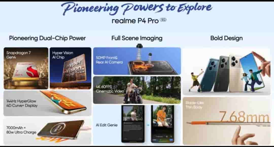 Realme P4 Pro 5G features a 6.8-inch HyperGlow 4D Curve+ display that offers a 144Hz refresh rate and 6500 nits peak brightness. It is powered by the Snapdragon 7 Gen 4 SoC, which arrives with a 1.10 million+ AnTuTu score. It packs up 50MP Sony IMX896 main camera and an 8MP ultra-wide-angle camera on the rear side, while on the front it features a 50MP selfie camera. It is 7.68mm thin and weighs 189g.