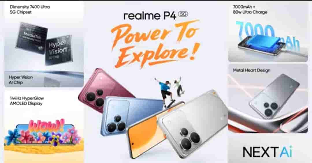 Realme P4 5G features a 6.77-inch HyperGlow AMOLED display that offers a 144Hz refresh rate and up to 4500 nits brightness. It is powered by the MediaTek Dimensity 7400 SoC, which arrives with an AI-powered NPU. The device packs up 50MP wide-angle camera and an 8MP ultra-wide-angle camera on the rear side, while on the front it features a 16MP selfie camera. It is 7.58mm thin and weighs 185g.