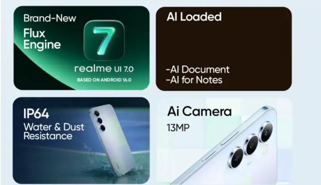 It is equipped with a 13MP AI rear camera. The device runs on Realme UI 7.0, and the company has promised 2 Android OS updates and 3 years of Android security patches. There are two colour options: Mosaic Green and Mosaic Blue.