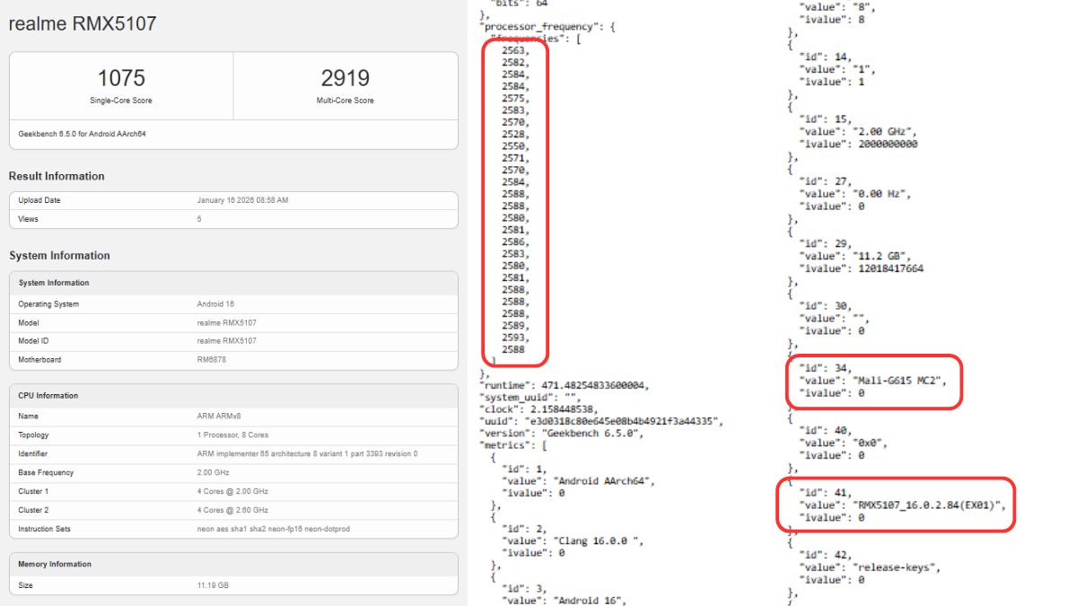 Now, the Geekbench listing reveals that the prototype managed to score 1,075 points in the single-core test and 2,919 points in the multi-core test. Under the CPU information, it shows two CPU clusters, with one cluster featuring 4 cores clocked at 2.60GHz and the other running at 2.00GHz. It also confirms that, at the time of testing, the device was running Android 16 (version number “RMX5107_16.0.2.84(EX01)”) along with 12GB RAM (11.19GB shown in the listing).
