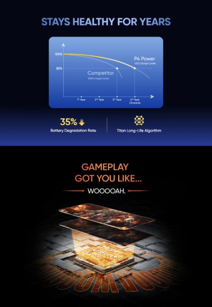 The microsite also claims that the realme P4 Power 5G supports up to 1,650 charge cycles, compared to around 1,200 cycles on competing devices. This is said to be enabled by the Titan Long-Life Algorithm and a claimed 35% lower battery degradation rate.