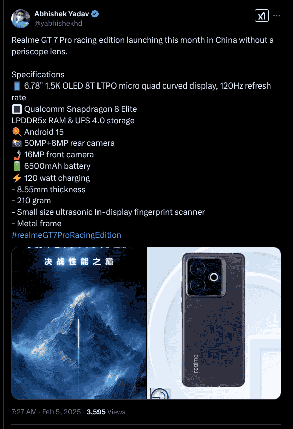 Following the November 2024 release of the GT 7 Pro device, Realme was believed to unveil a standard GT 7 smartphone soon, however, it seems that a GT 7 Pro Racing Edition model instead will be launching next in the series. This upcoming device is pointed out to have its launch in February 2025 itself and has been teased to offer improved performance, reportedly without a periscope telephoto camera.