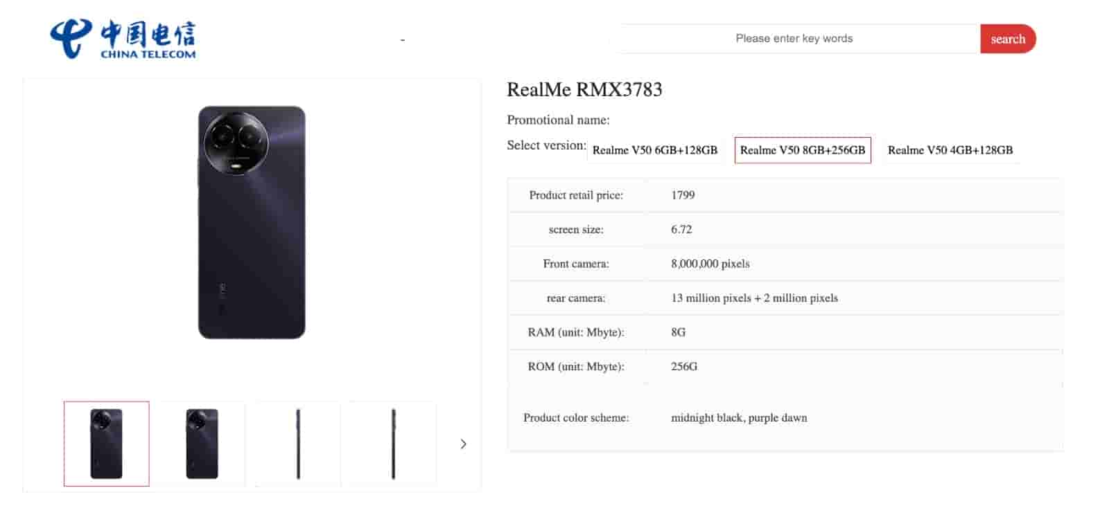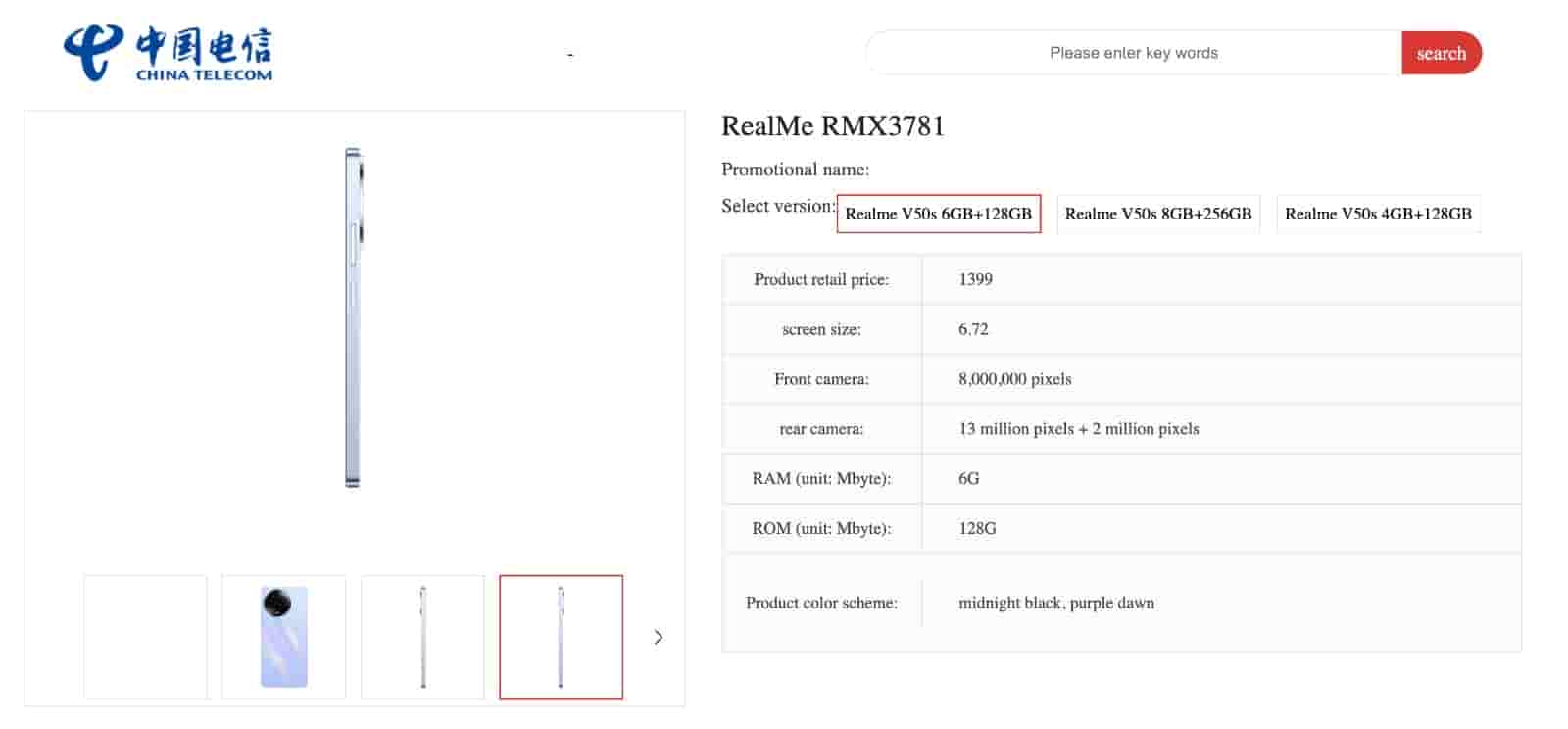 The upcoming Realme V50 and V50s smartphones have appeared on the China Telecom website with the model numbers “RMX3783” and “RMX3781″, respectively. The two devices will arrive with three storage options and two color choices.