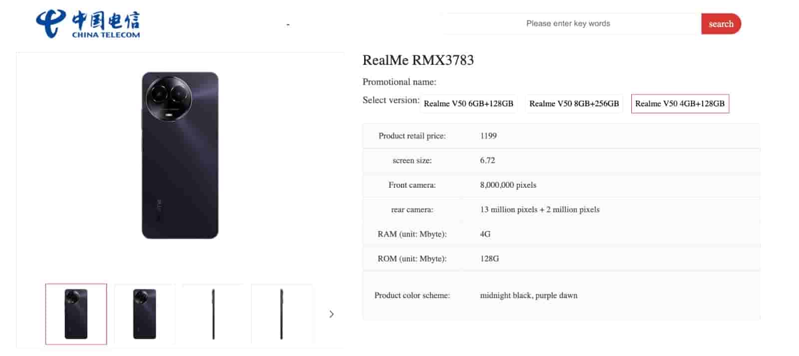 The render images of Realme’s V50 smartphone feature the same design as the V50s model and again, it resembles the Realme 11 5G, Realme 11x 5G, and the Realme Narzo 60x 5G devices. Do note that the Midnight Black color variant of the Realme V50 smartphone has been listed on the China Telecom website.