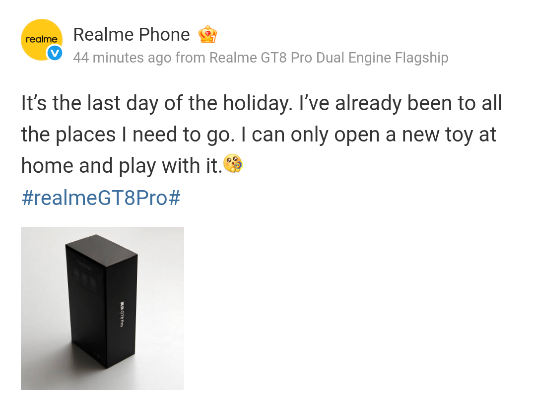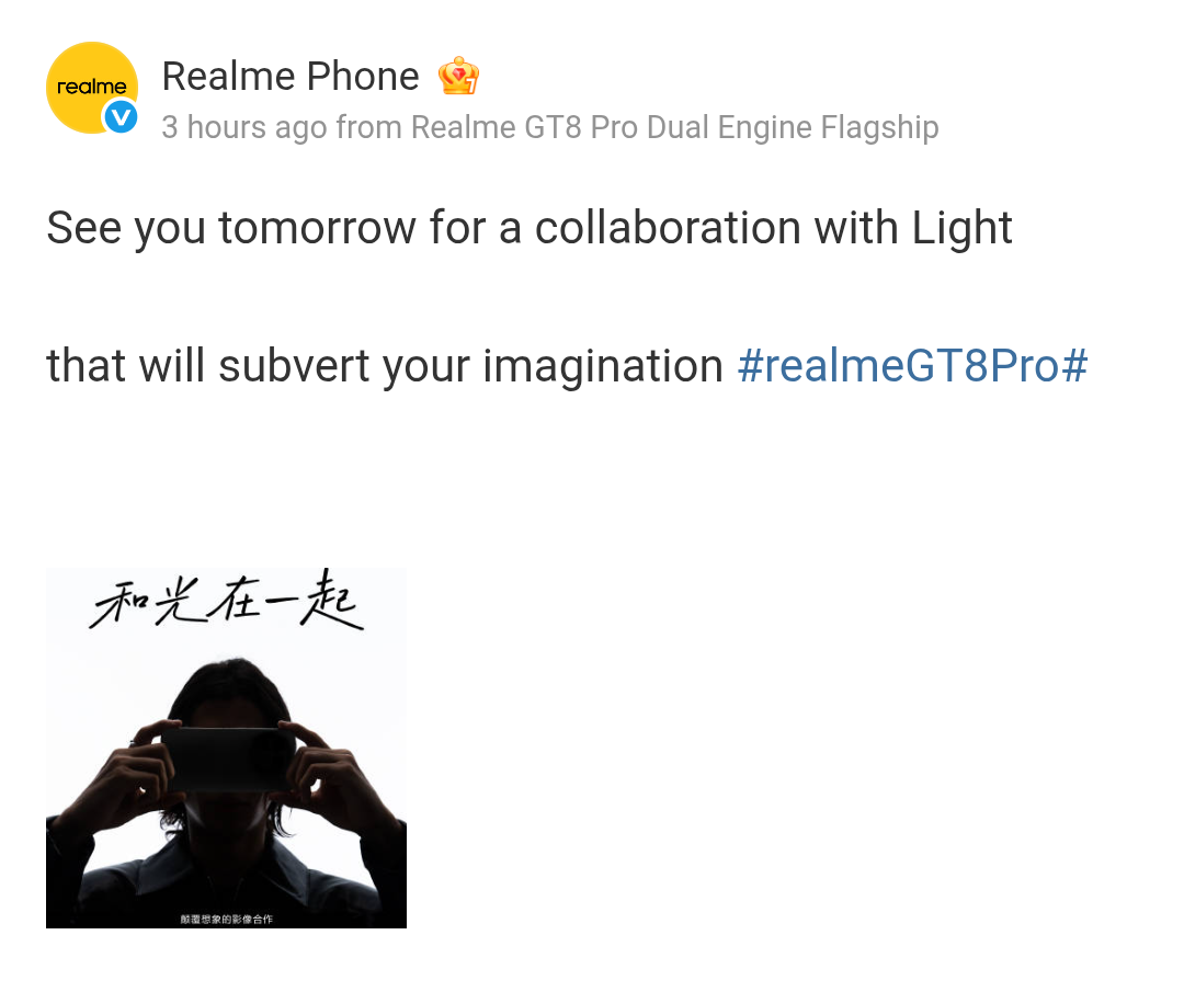Earlier last month, it was reported that Realme is partnering with Ricoh for its Realme GT 8 series and tomorrow it will be officially announced. Via the brand’s Weibo handle, the update has been shared with the tagline – ‘image collaboration that subverts imagination’, and the camera partnership will be for the Realme GT 8 Pro smartphone model. Along with this update, the brand has also officially revealed the Realme GT 8 Pro’s packaging box. It will come in a Black-colored box and considering the size of the box, we can expect a charging adapter and may be a protective case too (along with other components) within it.
