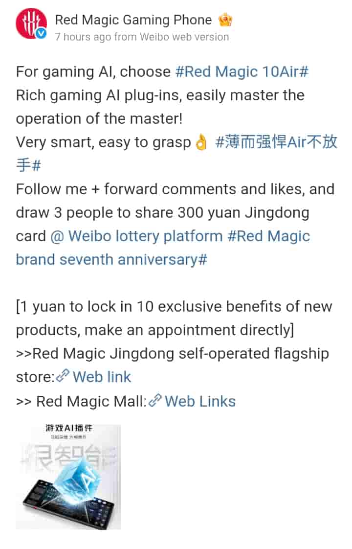 As per the newly-shared teaser update, the Red Magic 10 Air is revealed to offer rich gaming AI plug-ins for its users. This allows users to get a better game play experience and easily outcome the obstacles and challenges of the game. The Weibo post shared also points out that for gaming AI, users must choose the upcoming Red Magic 10 Air smartphone.