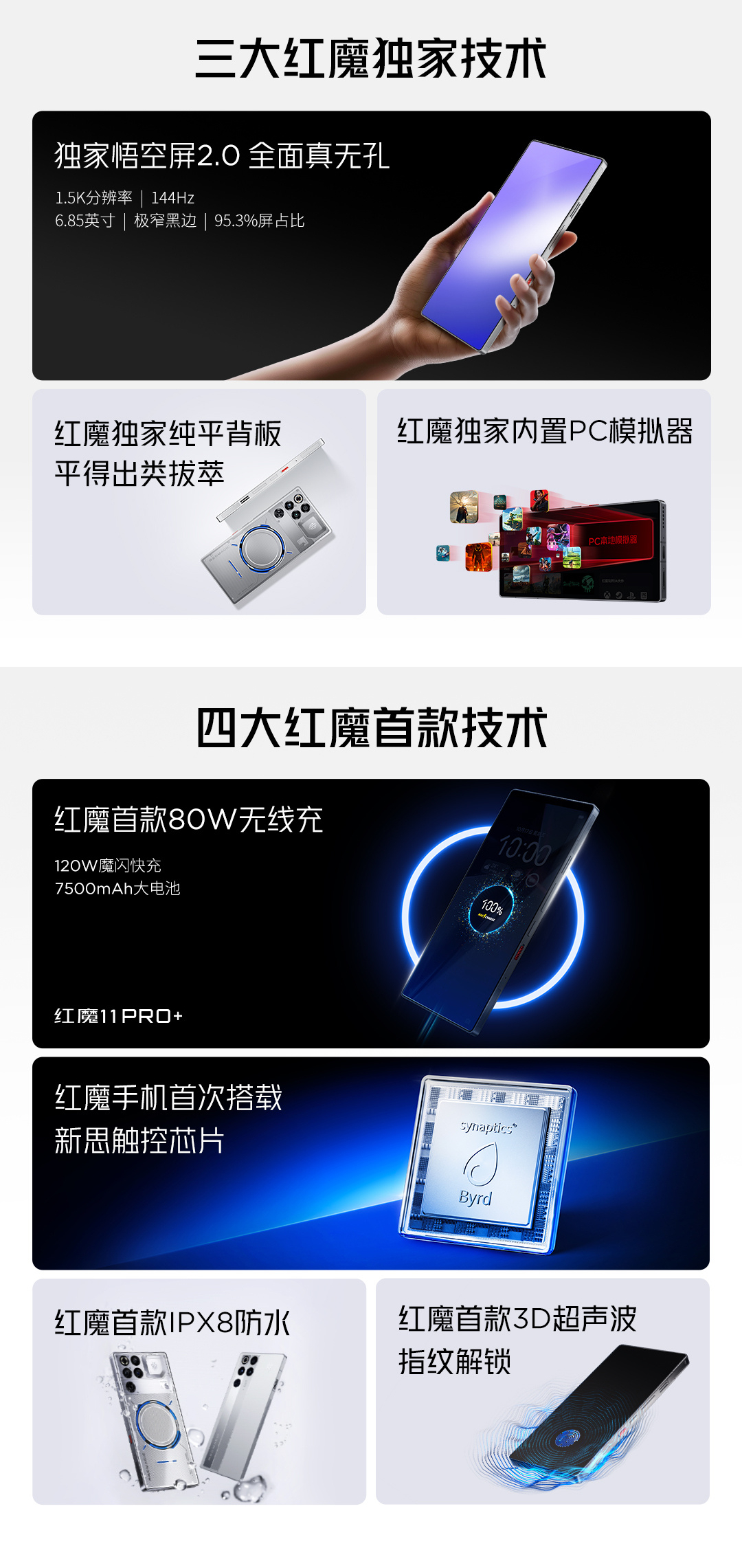 Speaking more, the exclusive Wukong Screen 2.0 (fully hole-free) is given on the device, featuring 6.85″ screen size, ultra-thin Black borders, 95.3% screen-to-body ratio, 1.5K resolution, and 144Hz refresh rate. RedMagic’s exclusive flat rear panel and exclusive built-in PC emulator are also notable specs of the series. Four new technologies are also added specs of the RedMagic 11 Pro series, and these include the first 80W wireless charger (for the RedMagic 11 Pro+ which additionally also packs a 7500 mAh battery and supports 120W wired charging), Synaptics touch chip (for the first time), IPX8-rated waterproof rating (for the first time), and the 3D ultrasonic fingerprint scanner (for the first time).