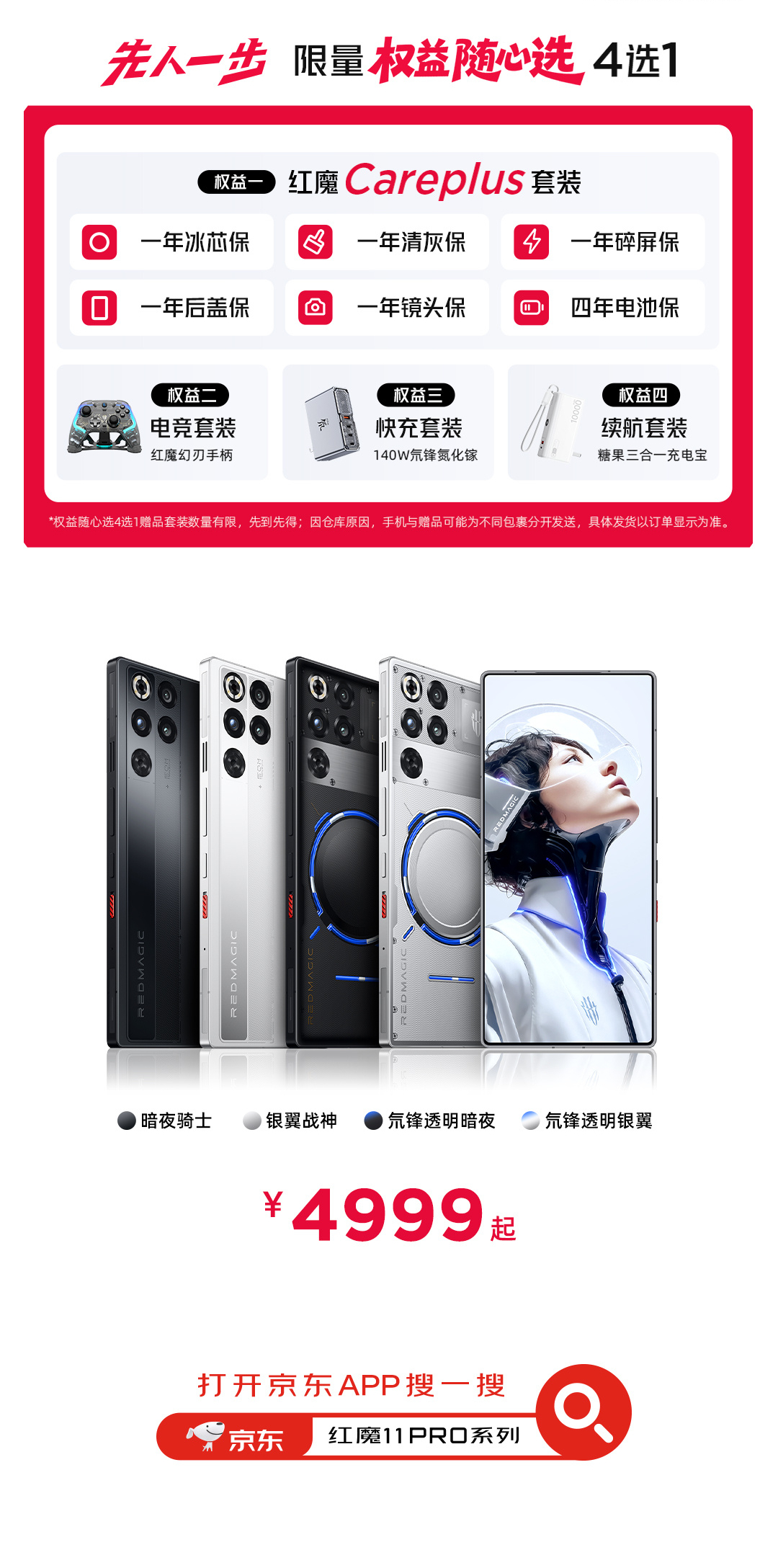 Limited benefits like RedMagic Careplus Set (consisting of one-year ice core warranty, one-year dust cleaning warranty, one-year screen protection, one-year phone warranty, one-year lens warranty, and four-year battery warranty), e-sports set (with the RedMagic Blade Handle), fast charging set (with the 140W Deuterium GaN charger), and battery life set (candy 3-in-1 power bank) are also available and customers can choose one out of the four.