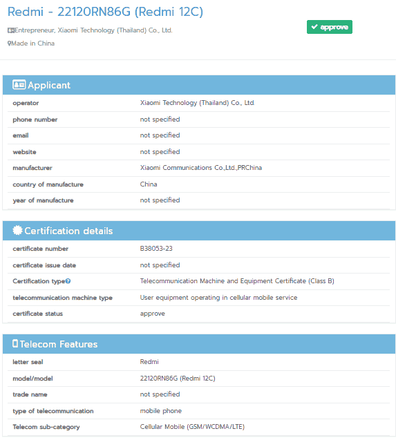In the NBTC’s database, the Redmi 12C has appeared with 22120RN86G. Last week, the Indian version of the Redmi 12C with model numbers 22120RN86I and 22120RN86H was spotted at India’s BIS authority.