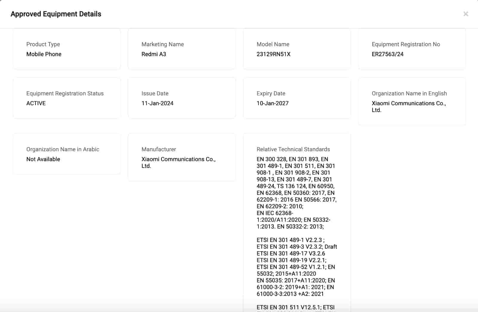 Ahead of its launch, the smartphone has once again been spotted on a certification website. Redmi A3 has been spotted on the TDRA certification website with model number 23129RN51X.