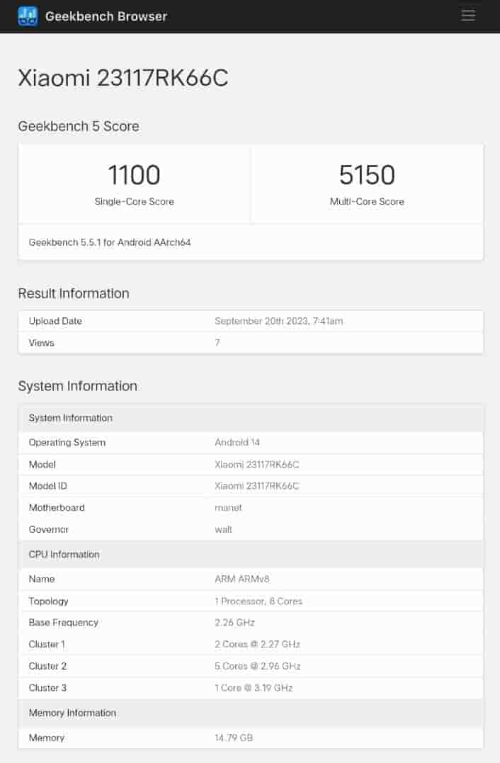 Now, the device has made it to the Geekbench database with a different model number – 23117RK66C, and just like the tipster had mentioned, the motherboard is not codenamed as “corot”.
