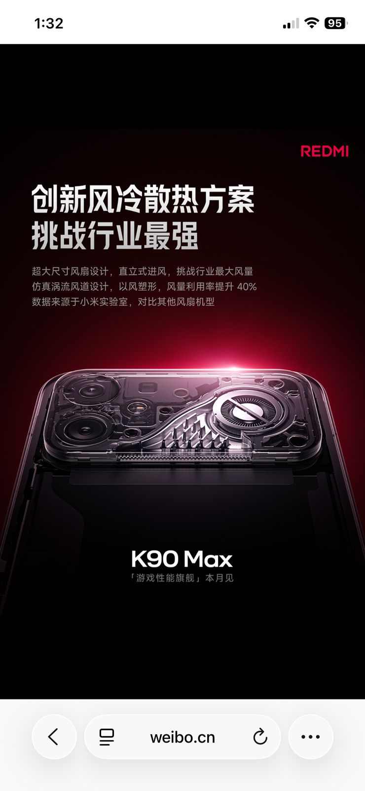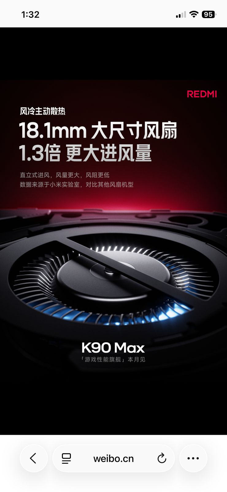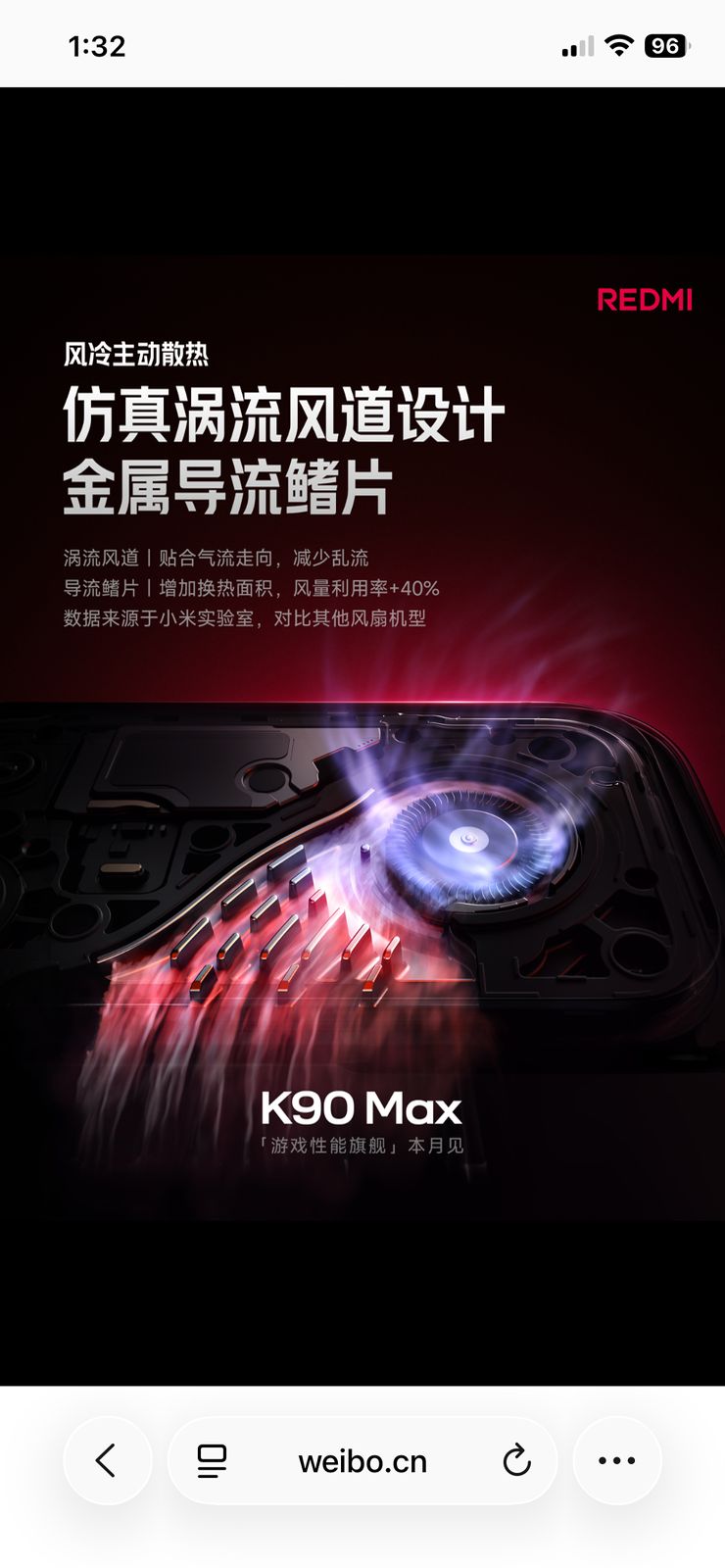 As revealed via a teaser shared on Weibo, Xiaomi has confirmed that the upcoming Redmi K90 Max smartphone will feature a newly-developed internal cooling system, aimed at delivering improved performance during heavy gaming usage. Speaking of it, the device is said to be equipped with a large 18.1mm vertical fan, capable of drawing in 1.3 times more air (0.42 CFM) compared to its competitors, along with a simulated vortex air duct design featuring metal fins that guides airflow directly over the heat source, thereby reducing turbulence and improving airflow efficiency by up to 40%.