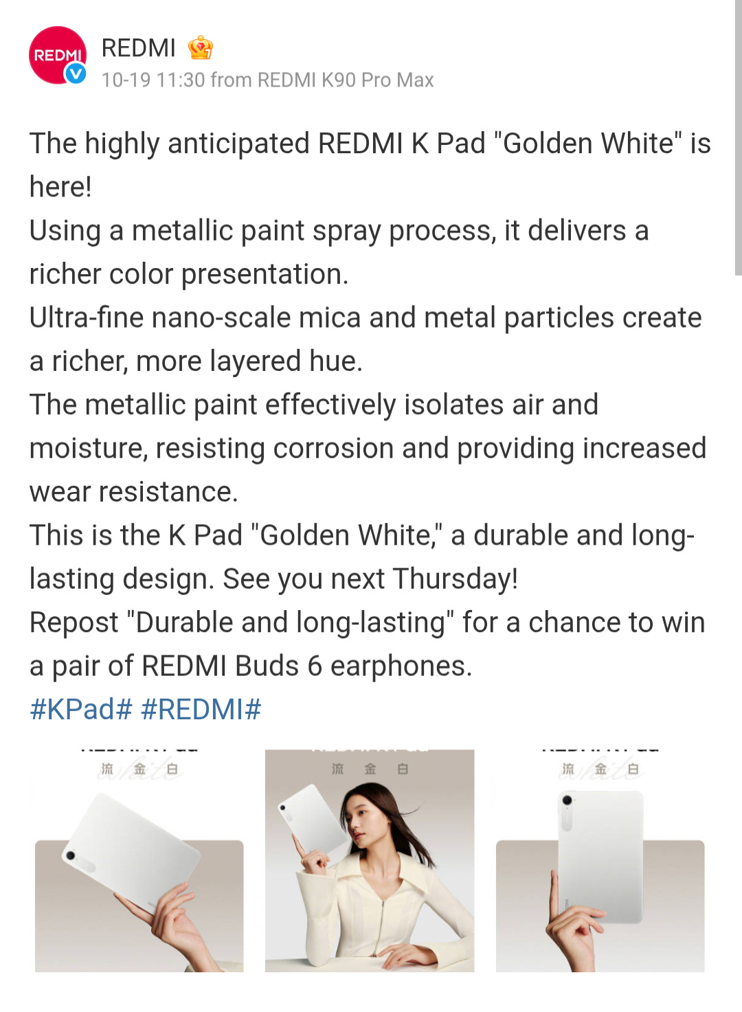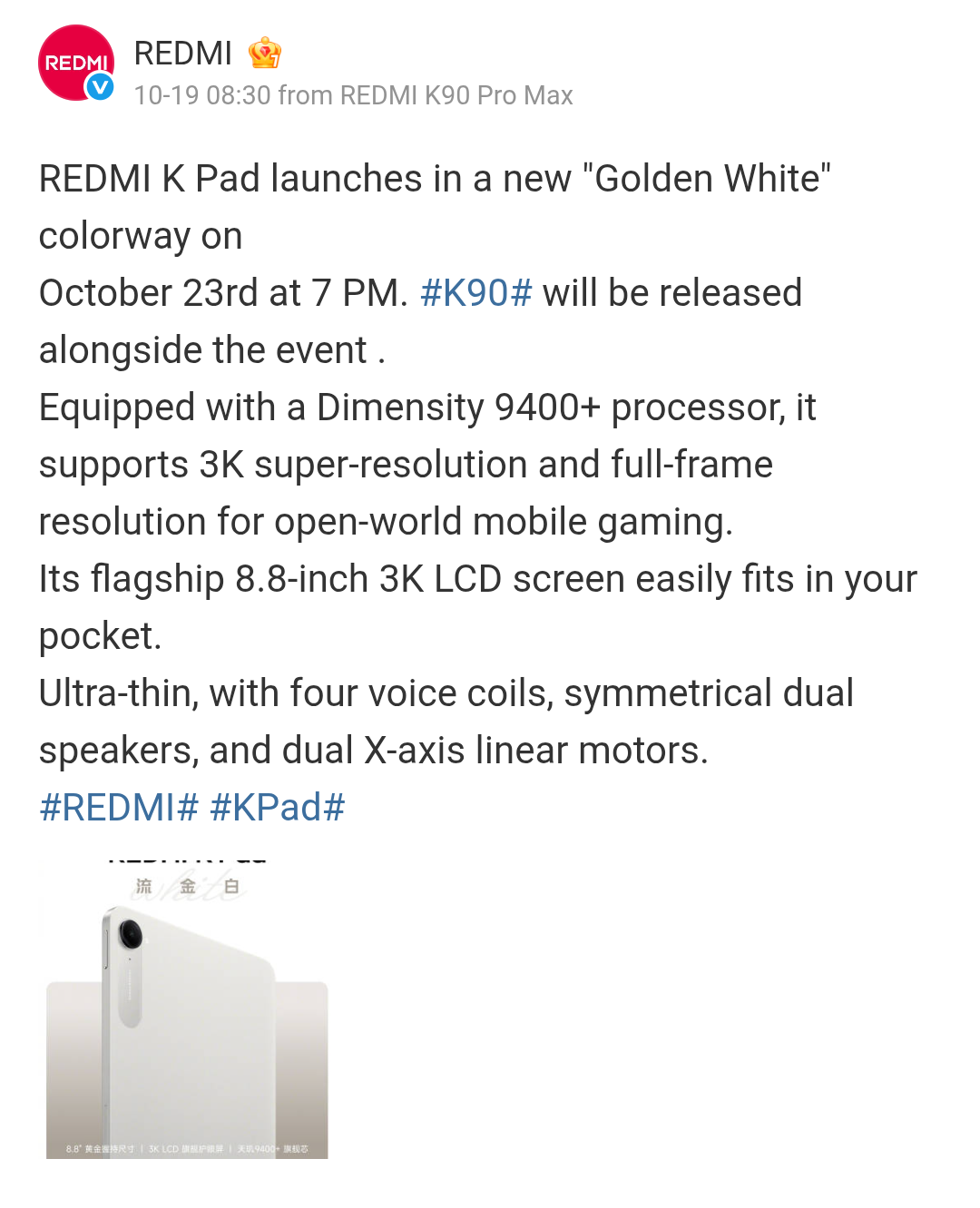 Both the Redmi K90 series and the Redmi Watch 6 products are confirmed to break their covers on the 23rd of October 2025 for Chinese customers and on the same day, the brand has now confirmed to bring out a new Golden White color variant for its June 2025-released Redmi K Pad tablet. Metallic paint spray process (for richer color presentation) and ultra-fine nano-scale mica and metal particles are used for its making. Moreover, key specs such as the MediaTek Dimensity 9400+ chip, flagship 8.8″ 3K LCD display, 3K super full-frame resolution for open world games, four voice coils, symmetrical dual speakers, and dual X-axis linear motor have been teased for the new color variant as well.