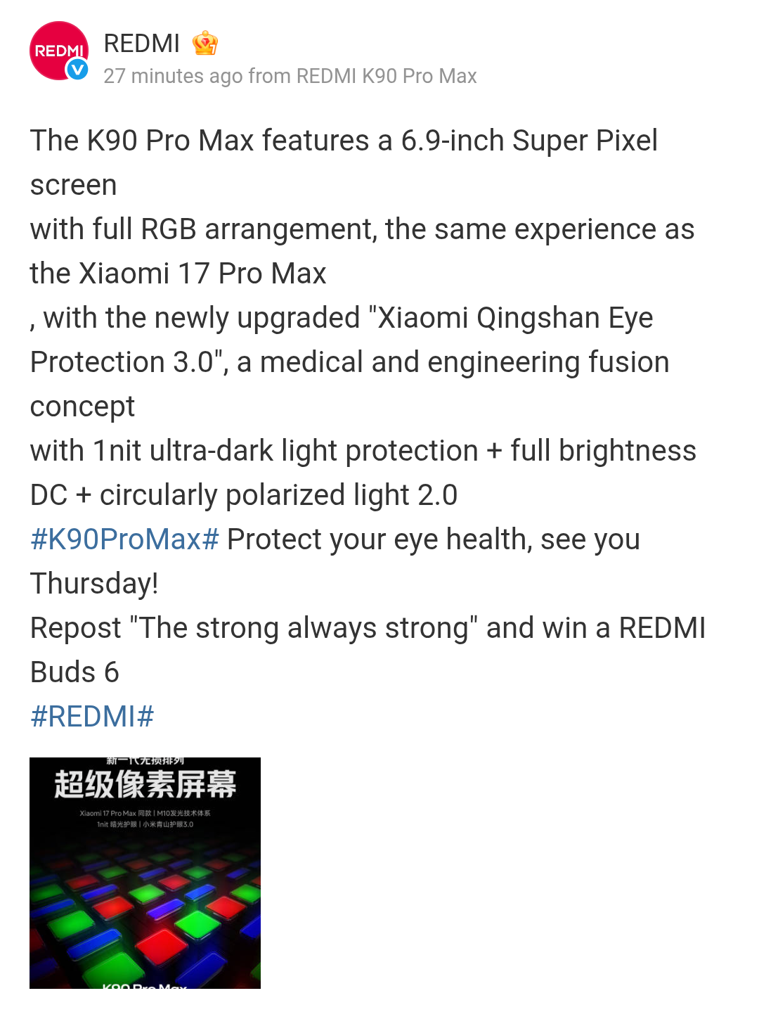 As per the newly-shared teasers, the Redmi K90 Pro Max smartphone is revealed to feature a 6.9″ Super Pixel Display with full RGB arrangement and it is claimed to offer the same display experience as that of the Xiaomi 17 Pro Max smartphone. The newly-upgraded Xiaomi Qingshan Eye Protection 3.0, 1-nit ultra-dark light protection, full brightness DC, and circularly polarized light 2.0 are more about its added display aspects.