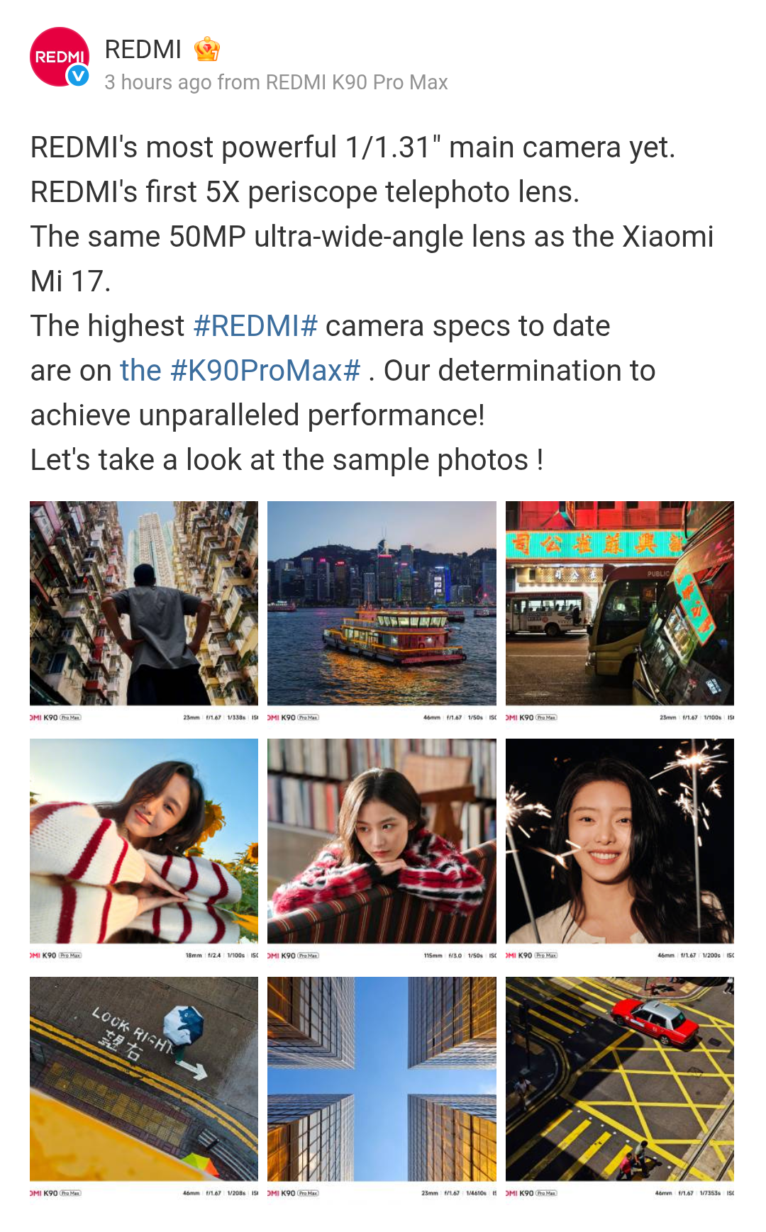On the camera side, Redmi’s K90 Pro Max smartphone will be sporting the Light Hunter 950 main camera sensor with a size of 1/1.31″ (same as the Xiaomi 17), boasting a 13.5EV high dynamic range, DXG high dynamic technology, and 1G+6P glass-plastic hybrid lens which reduces glare. It will also be packing Redmi’s very first 5x periscope telephoto camera lens which will offer 5x optical zoom, 10x lossless zoom, and OIS image stabilization. The triple camera system is completed with the 50MP ultra-wide camera (same as the Xiaomi 17). Also, 4K shooting has been teased for the upcoming device. Along with the camera specs, the brand has shared camera samples depicting the Redmi K90 Pro Max smartphone’s imaging quality.