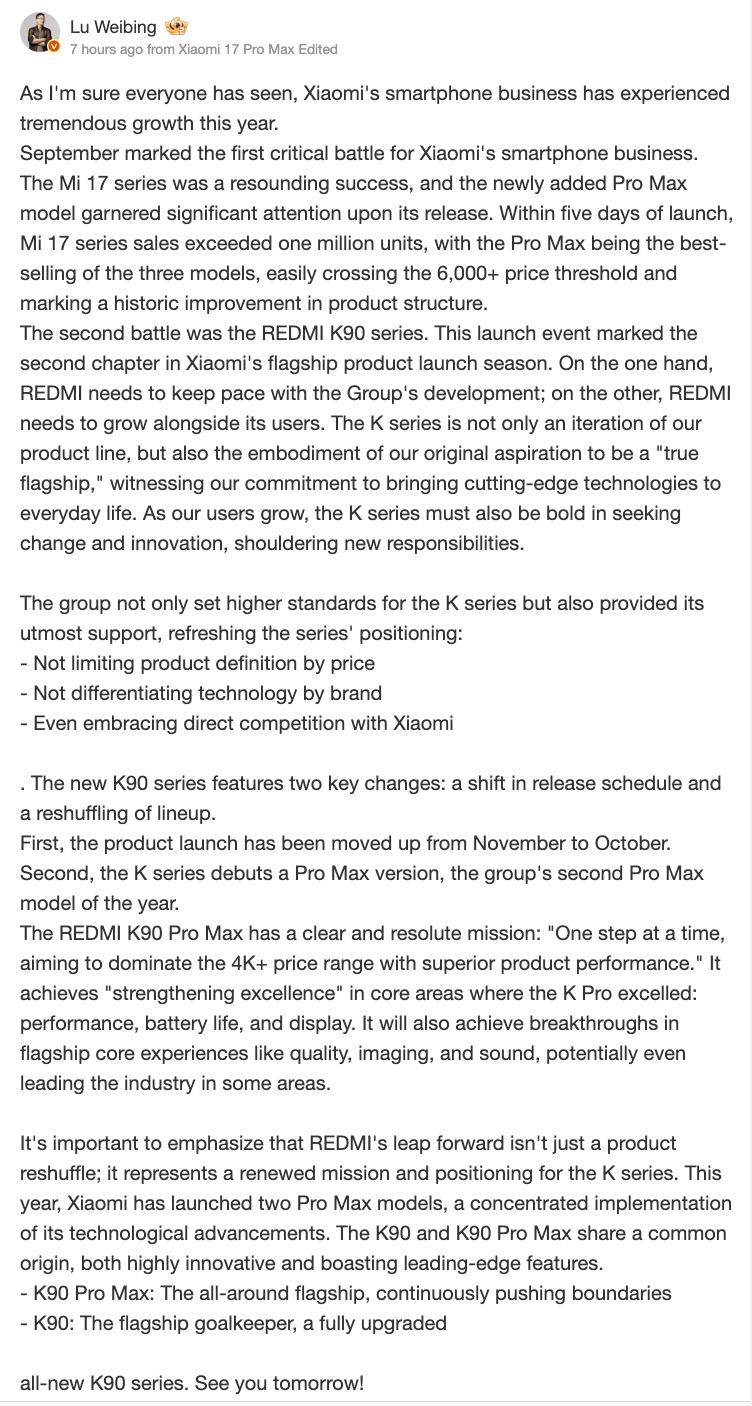 In his post, Lu Weibing revealed that the upcoming K series will bring two major upgrades — in terms of both specifications and lineup structure. He noted that the Redmi K series has so far included a standard and a Pro variant, but this time, the brand is introducing a Pro Max model for the first time in the K lineup.