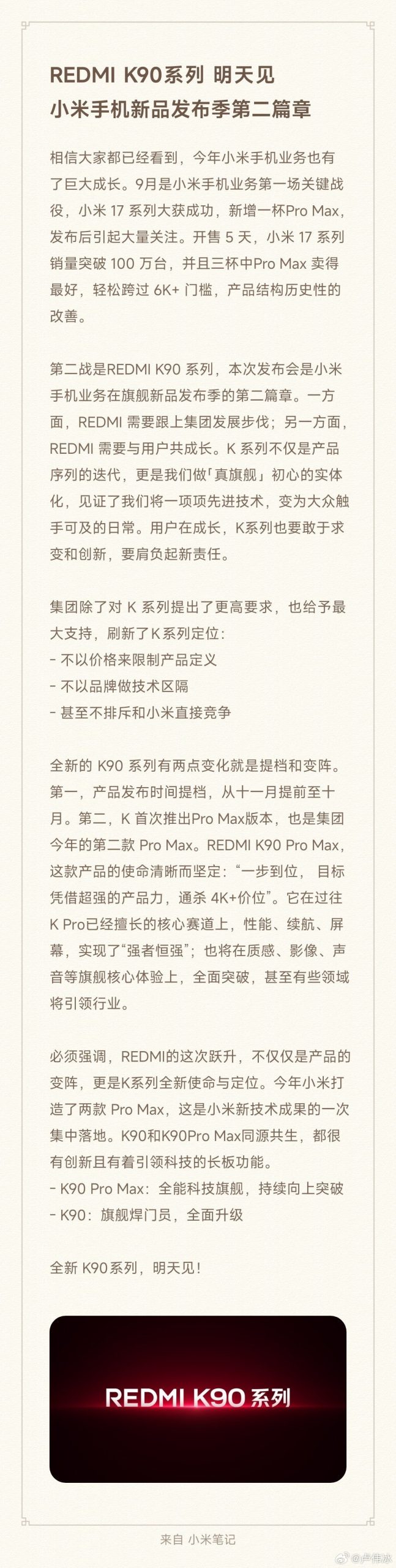 Lastly, he mentioned that the Redmi K90 Pro Max is described as “an all-around flagship, continuously breaking through,” while the Redmi K90 is referred to as “a flagship welding goalkeeper, fully upgraded.”