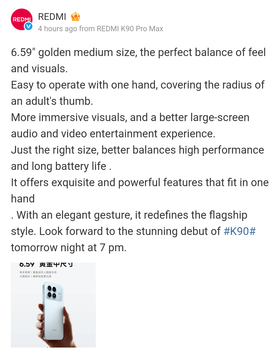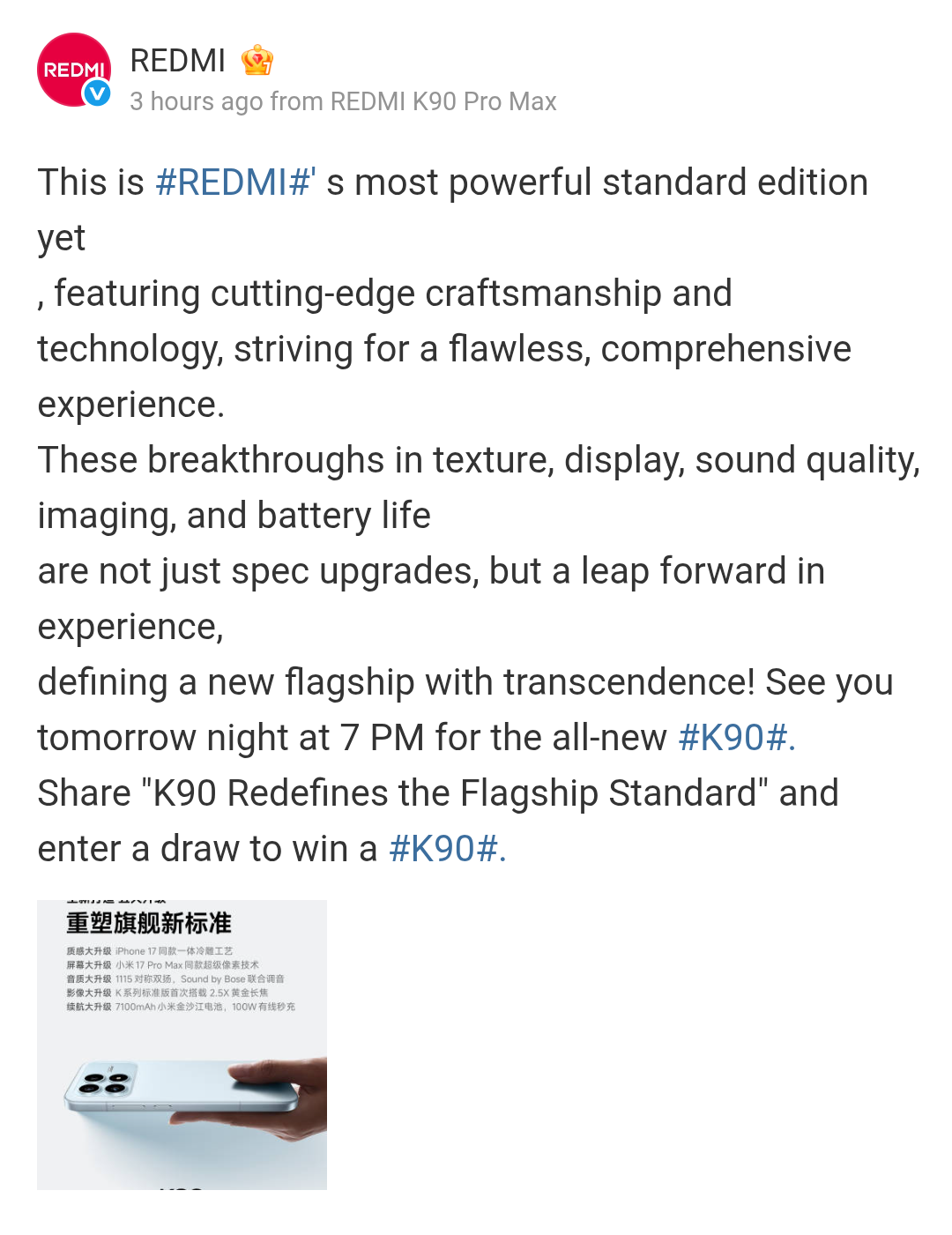 Redmi K90 Smartphone 6.59″ Display, 2.5x Telephoto Camera, 7100 mAh Battery, 100W Charging, and Other Upgrades Teased; Eason Chan Announced as Redmi Acoustic Ambassador