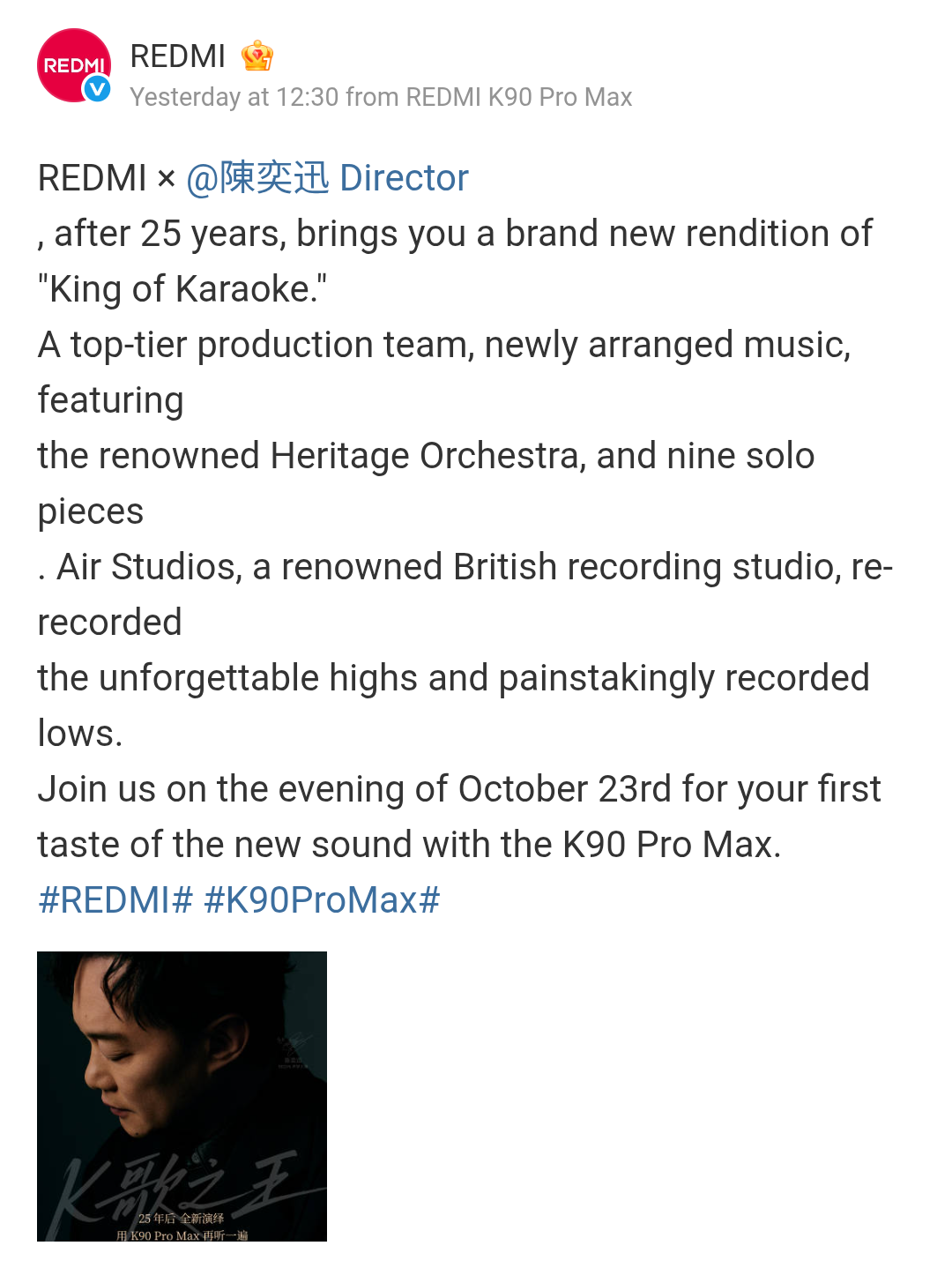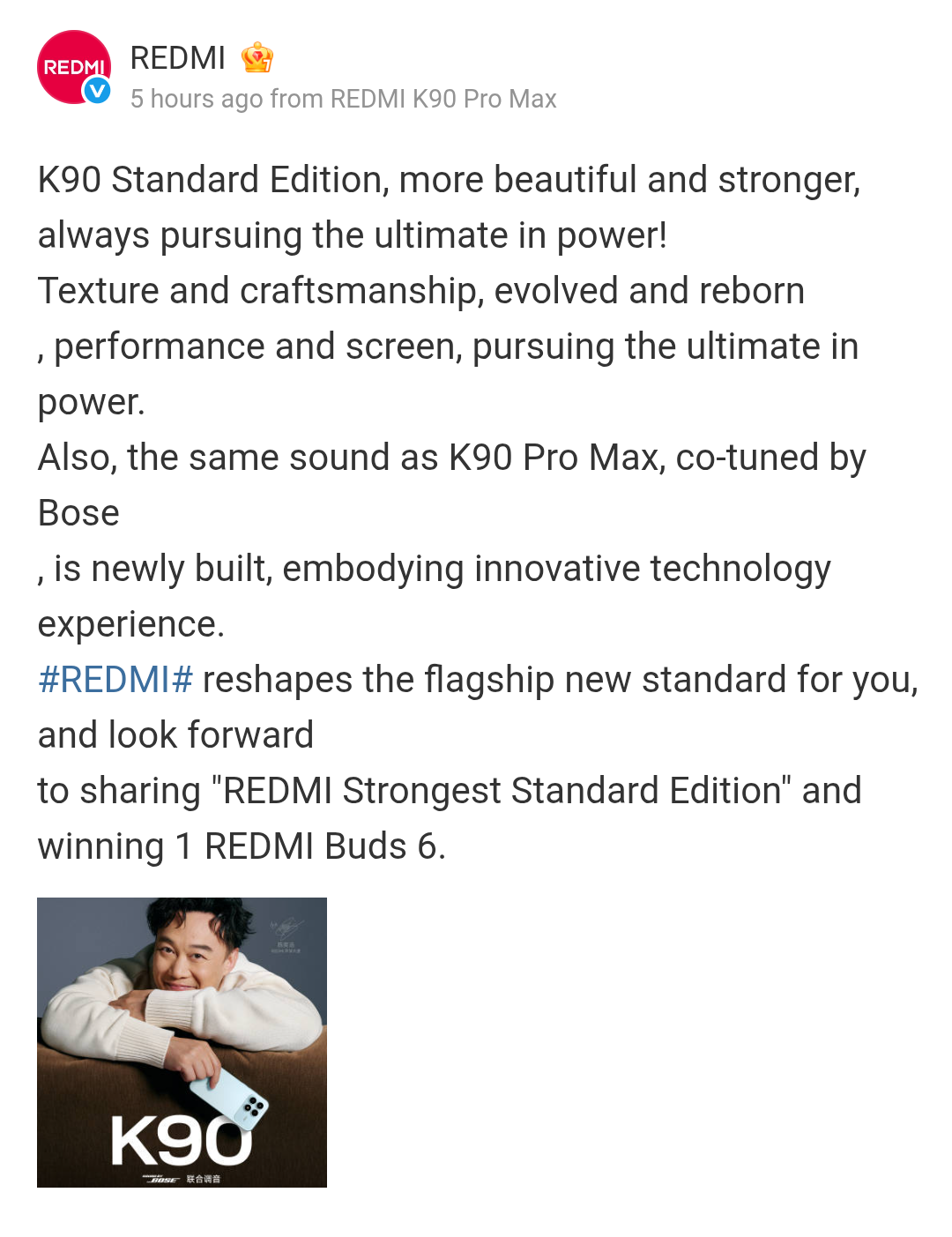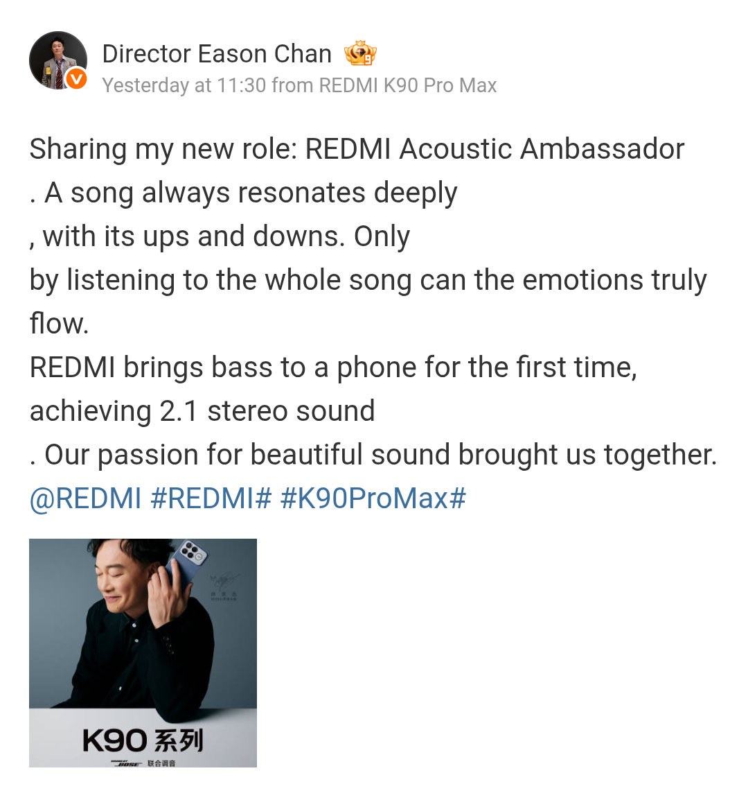 The Hong Kong-based singer and actor – Eason Chan has now taken charge as the Acoustic Ambassador for Redmi. The 2.1 stereo sound system of the Redmi K90 Pro Max, as well as the Redmi K90’s design, performance, screen, and Sound by Bose co-tuning have also been praised in the teasers featuring him.