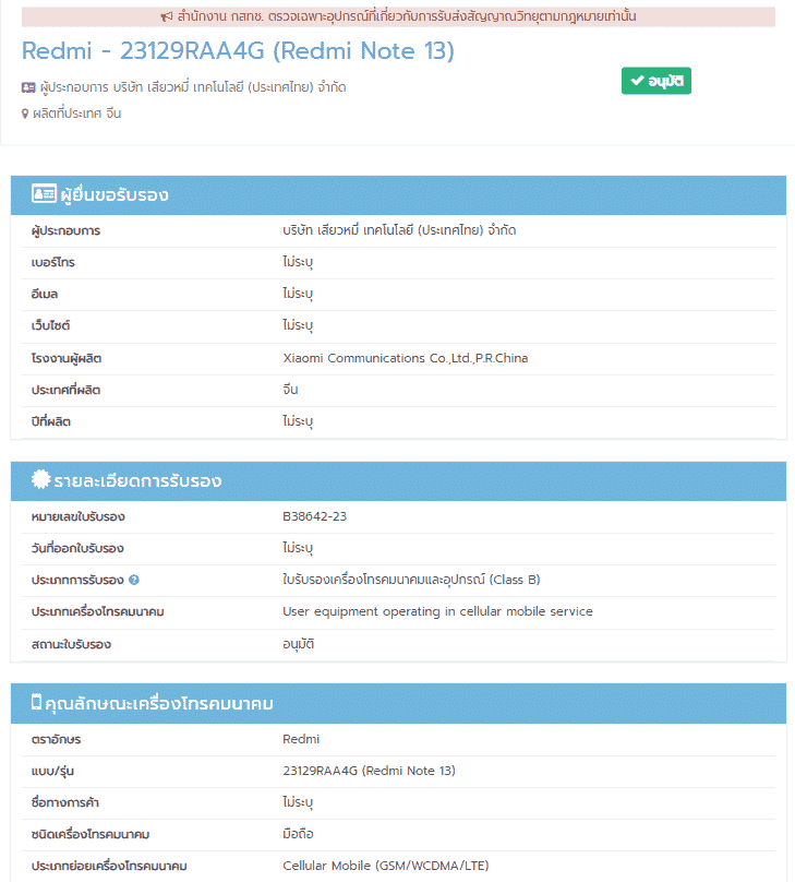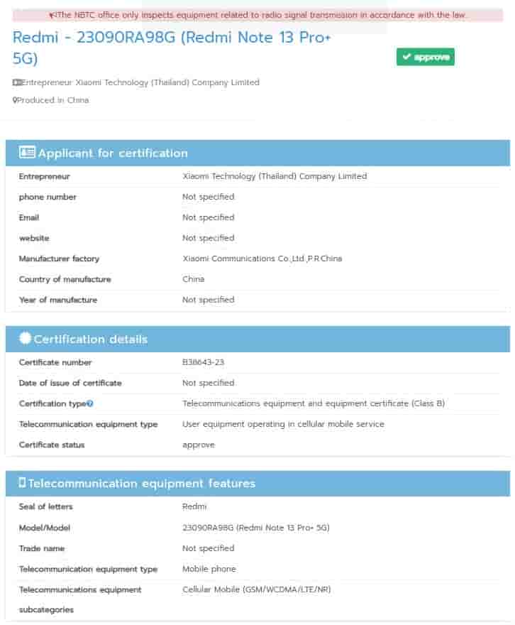 In November, the NBTC authority approved the Redmi Note 13 5G (2312DRAABG), the Redmi Note 13 Pro (23117RA68G) – a 4G device, and the Redmi Note 13 Pro 5G (2312DRA50G). The below screengrabs show that the 4G-enabled Redmi Note 13 and the Redmi Note 13 Pro+ 5G bearing 23129RAA4G and 23090RA98G, respectively, have also been certified by the NBTC. As usual, the NBTC listings do not have any information on the core specs of both models.