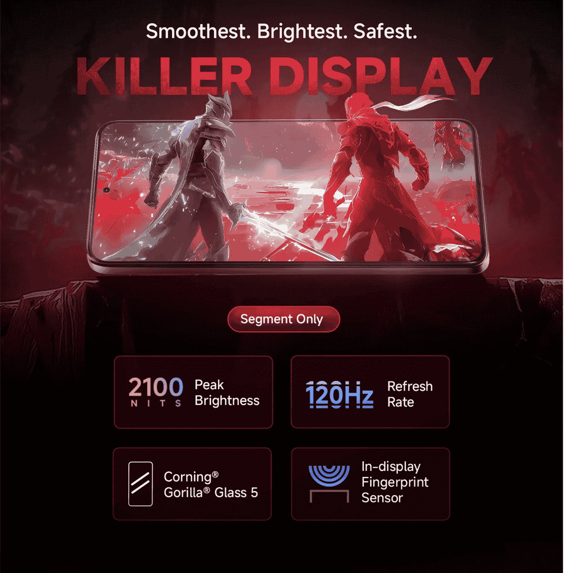 According to the microsite, the device will feature a display with 2100 nits peak brightness, a 120Hz refresh rate, Corning Gorilla Glass 5 protection, and an in‑display fingerprint sensor.
