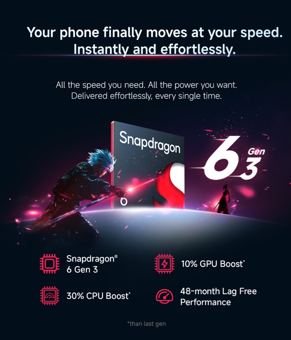 The device will be powered by the Snapdragon 6 Gen 3 SoC (just like the global variant). The chipset is said to offer 10% GPU Boost and 30% CPU Boost when compared to the previous generation chipset. It is claimed to offer 48-month lag-free performance.