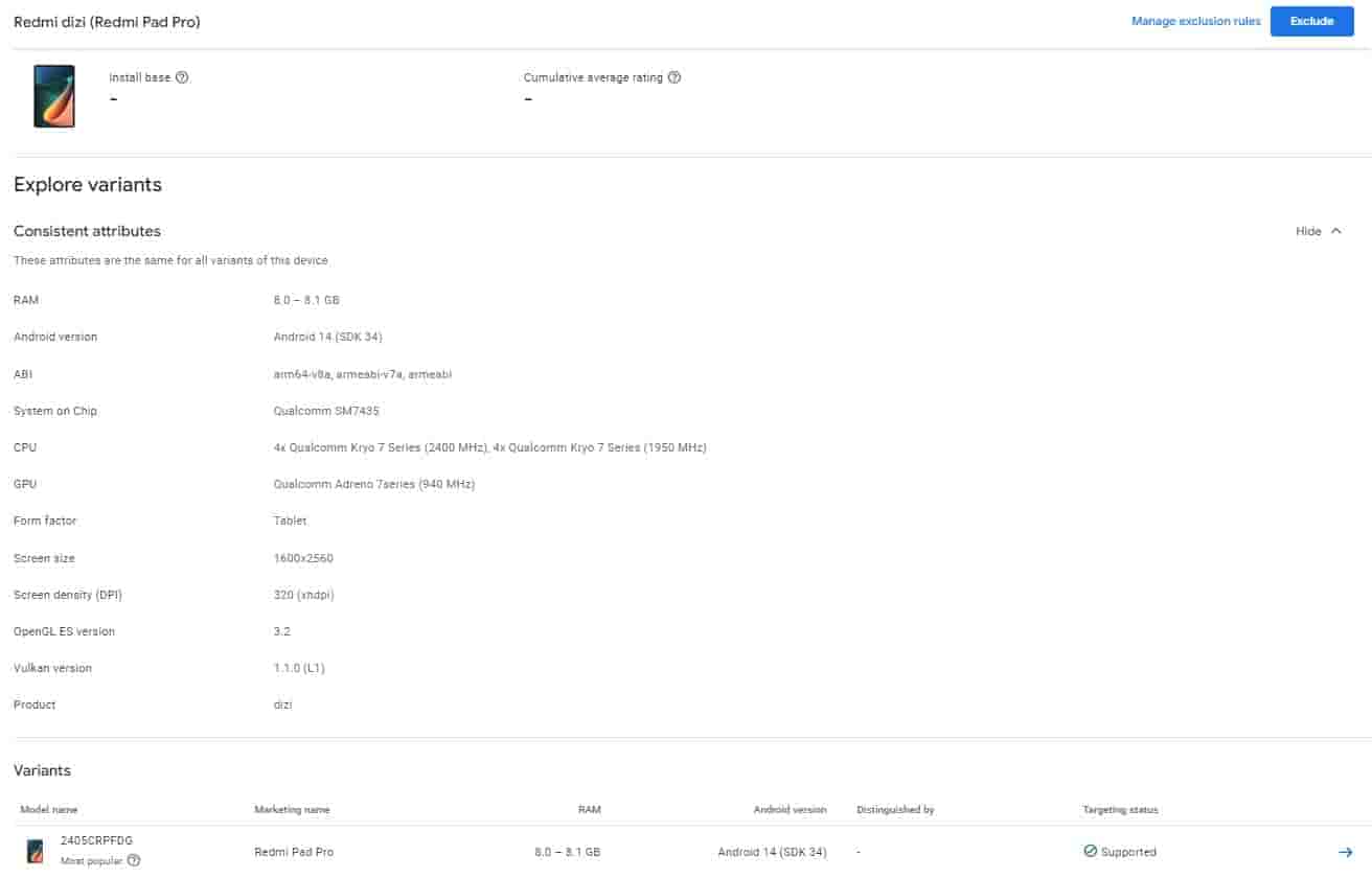 In the Google Play Console-supported devices list, we can see two model numbers “2405CRPFDC” and “2405CRPFDG”. The former model number corresponds to the recently launched Redmi Pad Pro in China, while the latter is the Global variant, yet to be launched. Previously Redmi Pad Pro Global keyboard and Stylus were also spotted on SDPPI, FCC, IMDA, NRRA, and TDRA certifications.