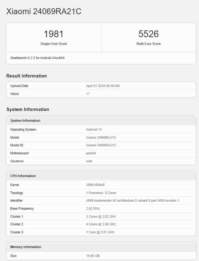 As per the listing, the Redmi Turbo 3 has appeared on Geekbench with the model number 24069RA21C. The smartphone has managed to get 1981 in the single-core test and 5526 in the multi-core test. The listing confirms that the smartphone will be powered by the Snapdragon 8s Gen 3 processor with a peak CPU Speed of 3.01GHz paired with Adreno 735 GPU. It will run Android 14 out of the box and will pack 16GB RAM(mentioned 14.96GB).