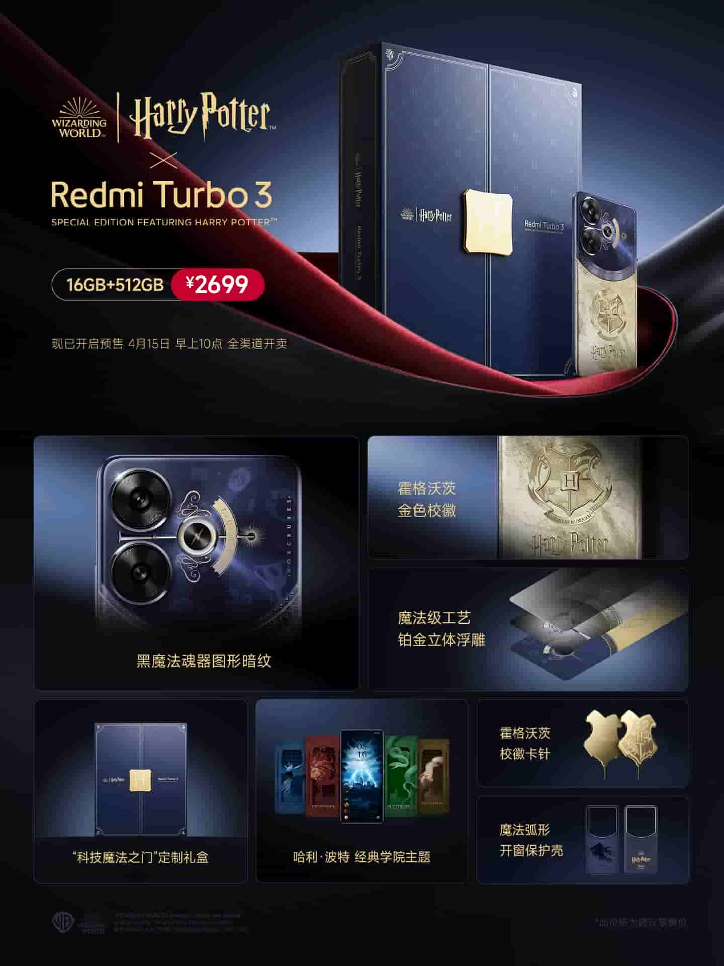 The Redmi Turbo 3 pricing starts from CNY 1,999(~$276) for the base variant 12GB+256GB. Its 12GB+512GB variant is priced at CNY 2,299(~$317) while its 16GB+512GB variant is priced at CNY 2,499(~$345). Its top-spec variant 16GB+1TB is priced at CNY 2,799(~$386). The Redmi Turbo 3 Harry Potter Edition smartphone packs 16GB RAM with 512GB storage and is priced at 2,699(~$375). The smartphone is available in three colour options Black Crystal, Green Blade, and Ice Titanium. It will go on sale from April 15th.