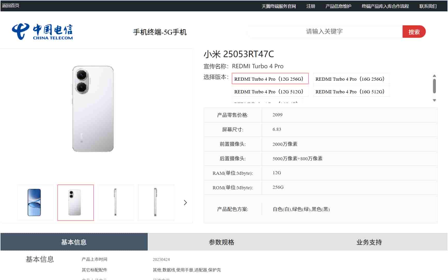 Coming to its China Telecom website listing (via, source), the device has been listed with the model number – ‘25053RT47C’ and previously it was also spotted on the 3C certification database with this same model number. Design-wise, it remains identical to the already-launched Redmi Turbo 4, whereas its revealed specs include the Qualcomm Snapdragon 8s Gen 4 chip, Android 15-based HyperOS 2.0, up to 16GB RAM, up to 1TB storage (UFS 4.0), 6.83″ flat OLED LTPS display with 1.5K resolution (2800 x 1280 pixels), 50MP (main, OIS) + 8MP (ultra-wide) dual camera unit, 20MP front camera, 7,550 mAh battery, and 90W wired fast charging (previously confirmed via 3C listing).