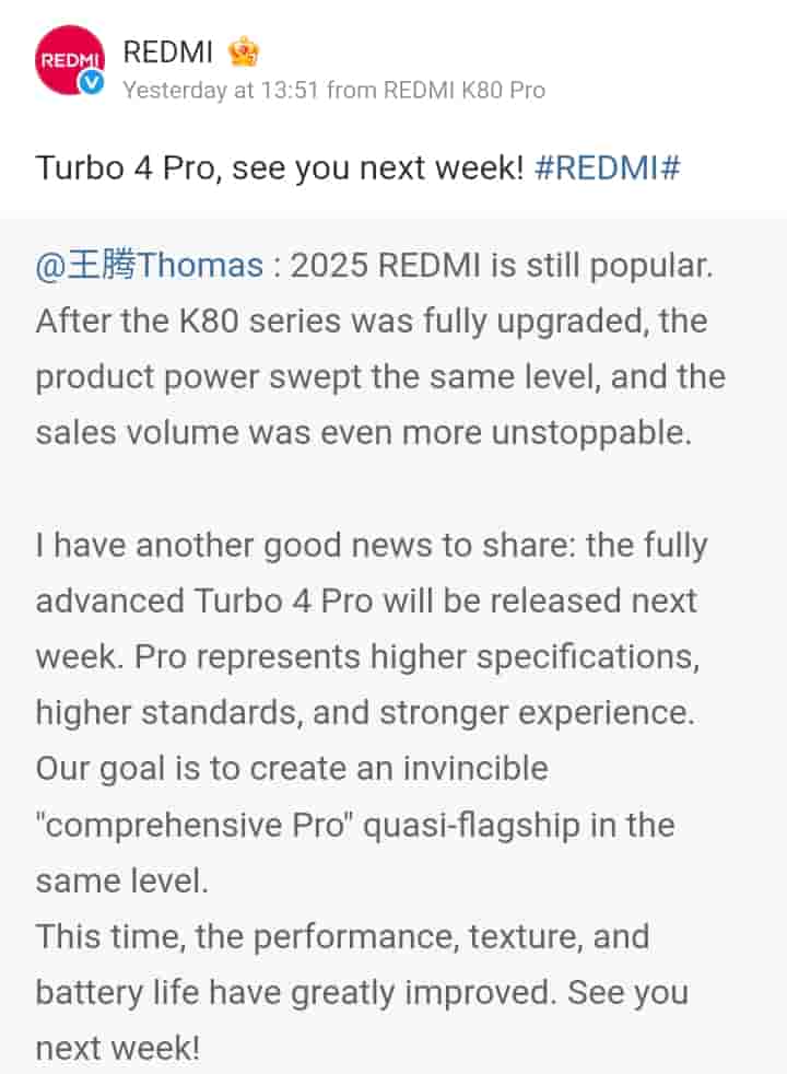 Redmi Turbo 4 Pro – Launching Next Week in China