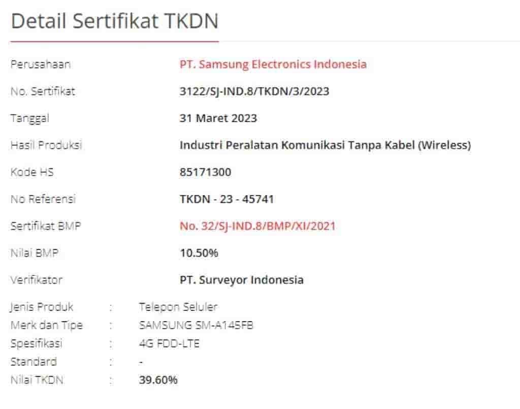The model number of this upcoming device is SM-A145FB and it has received the TKDN value of 39.60%. Along with this, the smartphone has received a BMP value of 10.50%. From the website, it was revealed that this upcoming device will support 4G network connectivity.